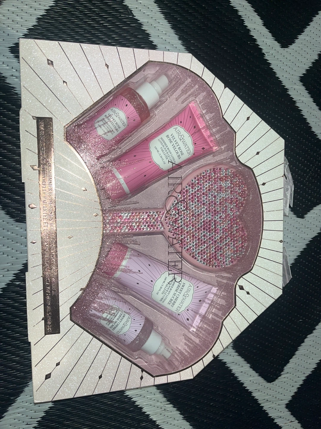 This AIR & WATER gift set includes a perfume, body lotion, and a matching hair brush. The perfume has a sweet cherry scent and comes in a 50ml bottle. The body lotion is also scented and comes in a 100ml tube. It's a great gift for anyone who loves sweet fragrances!
