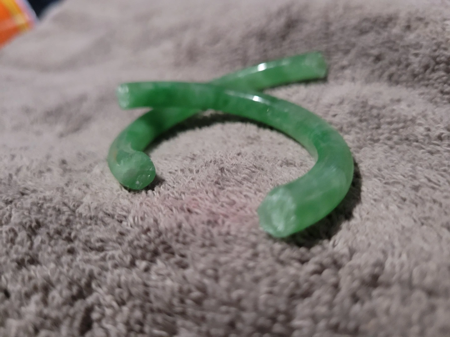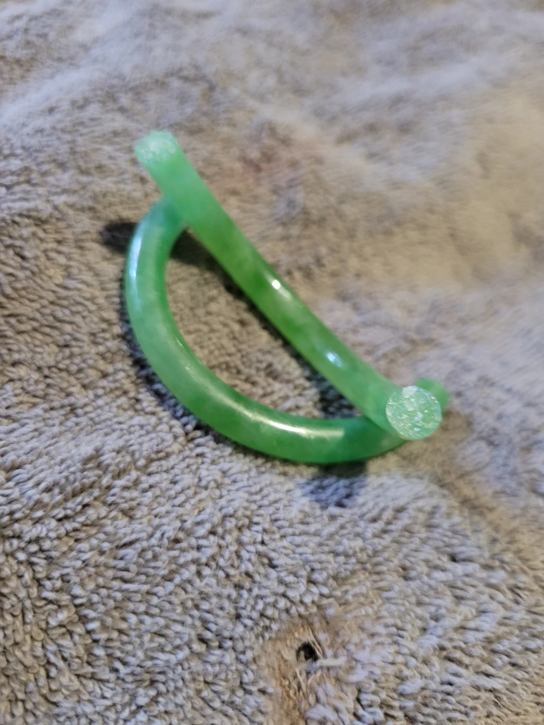Here are two green jade bangles! They would make a great addition to your jewelry collection. Jeweller told me these are a great to make into a gold capped adjustable easy open bracelet, jadeite is getting to be a rare item and prices have risen alot in the last couple years.