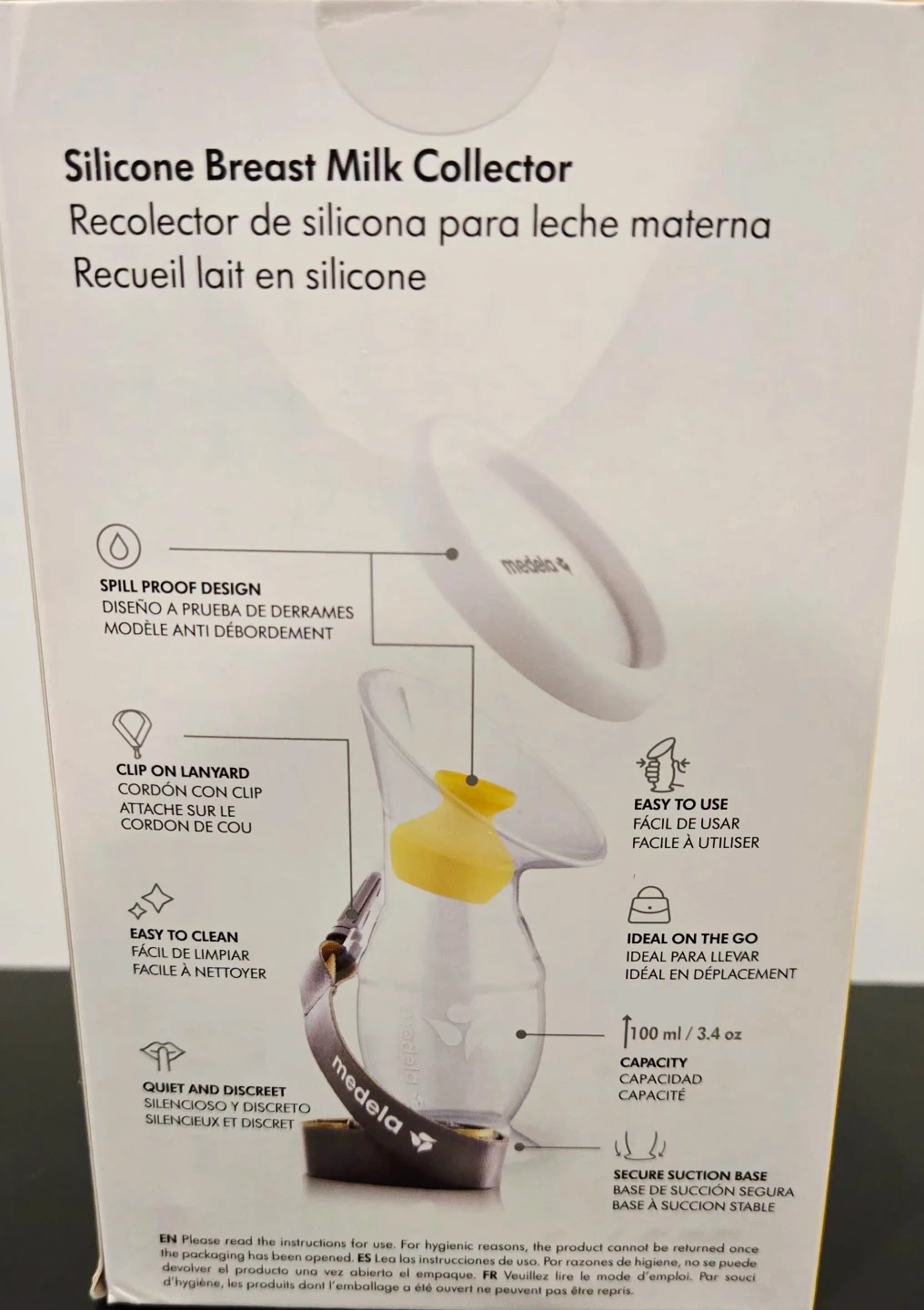 This Medela silicone breast milk collector is spill proof and easy to clean. It has a 110 ml / 3.4 oz capacity. Great for on-the-go use!