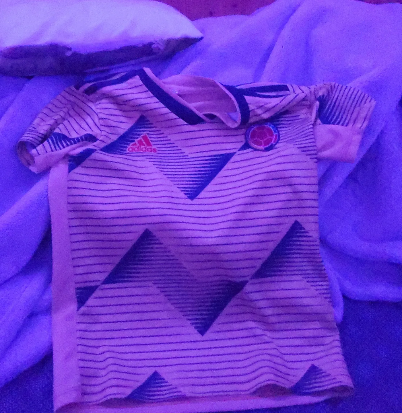 Selling an Adidas Colombia soccer jersey. It features the Colombia national team emblem and Adidas logo. The jersey has a unique design with blue geometric shapes and stripes on a yellow background. Perfect for any soccer fan!