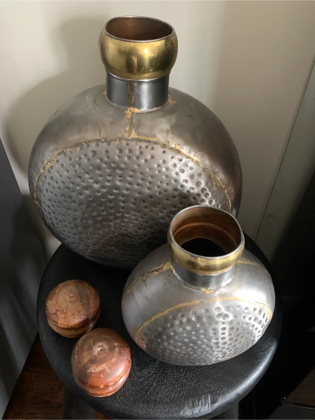 Set of 2 Hammered Metal Decorative Bottles with Wood Lids
