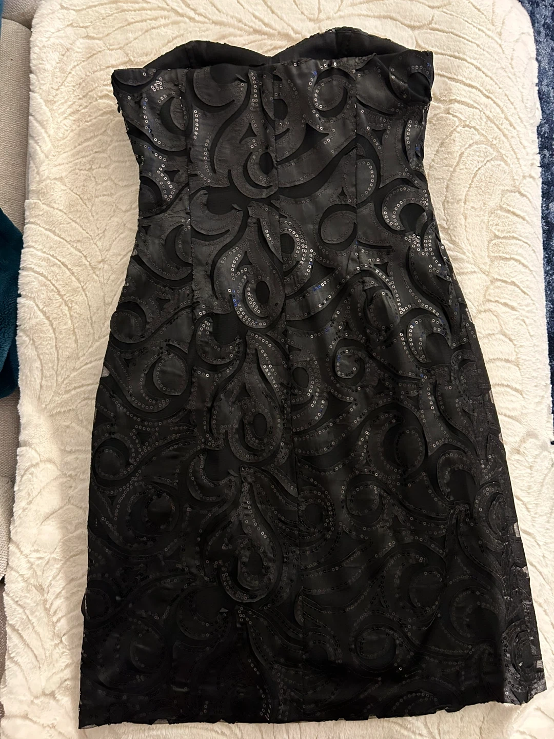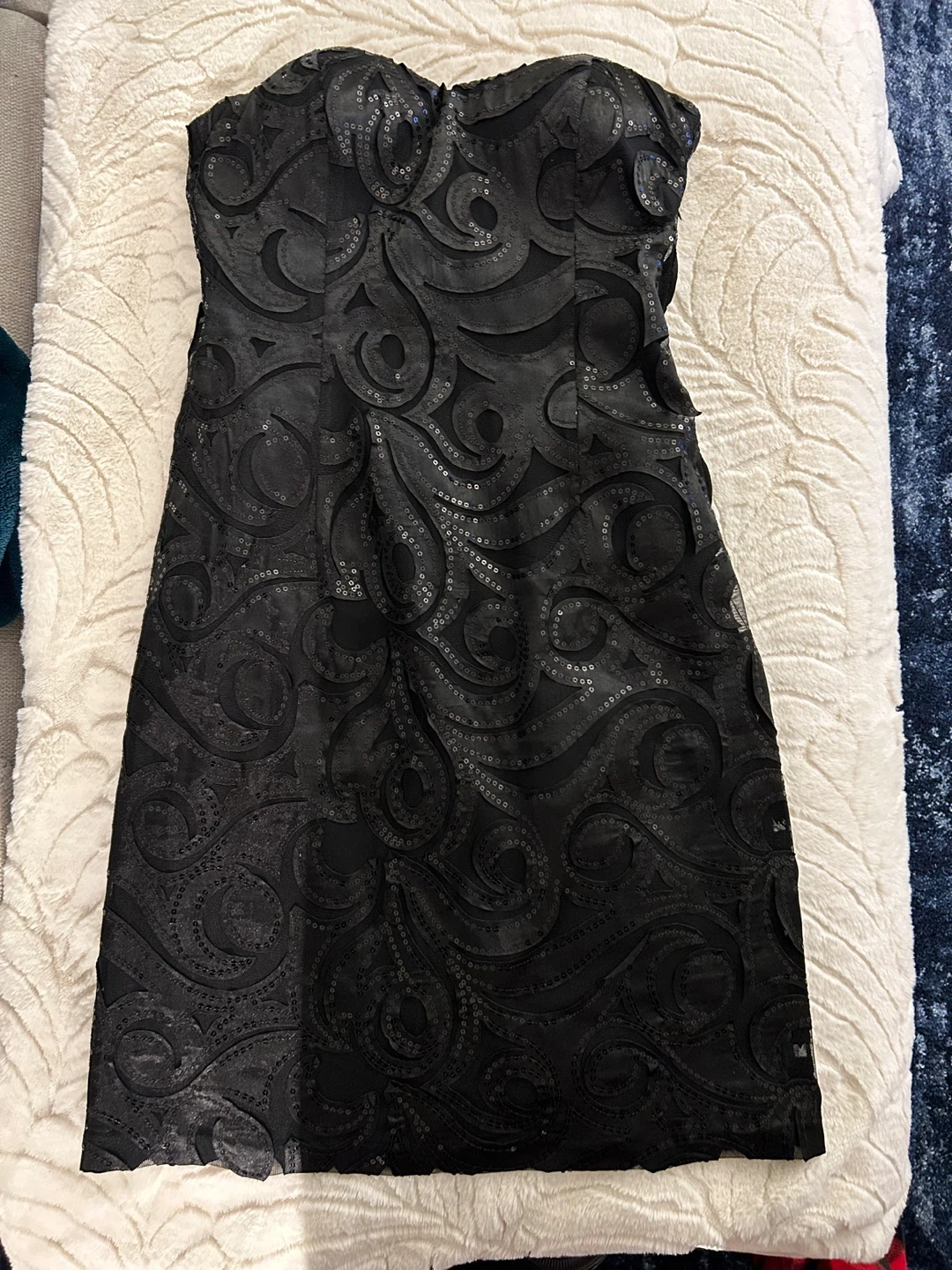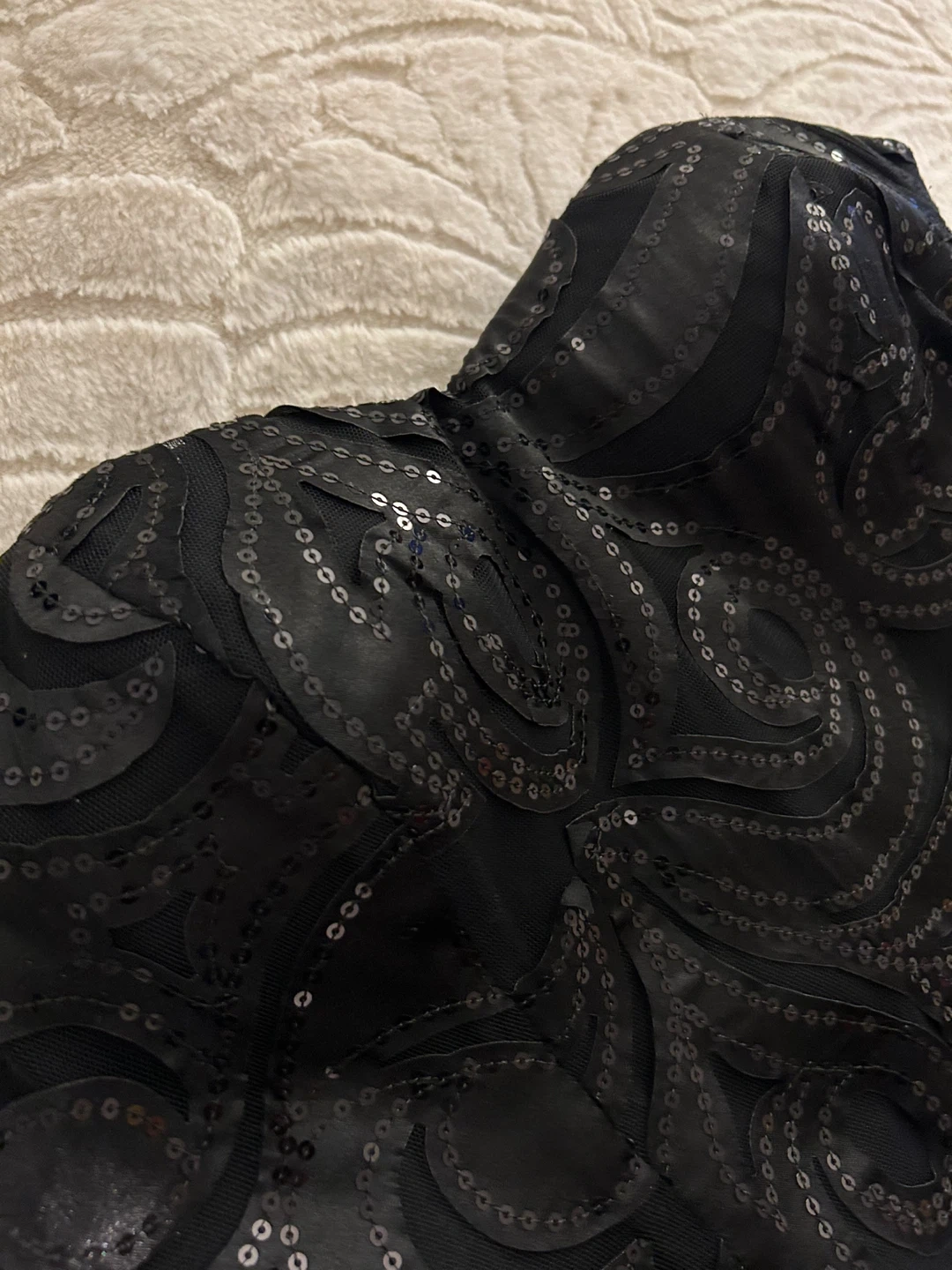 Charming Black strapless dress with a sequin swirl pattern. Mesh overlay and sequined detailing. Perfect for a night out!