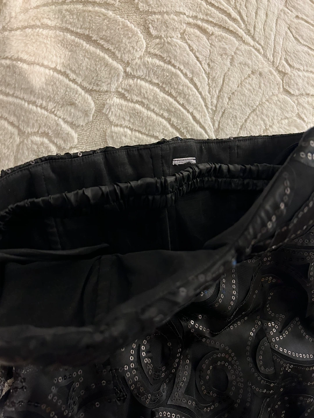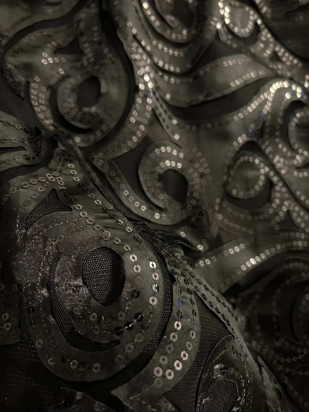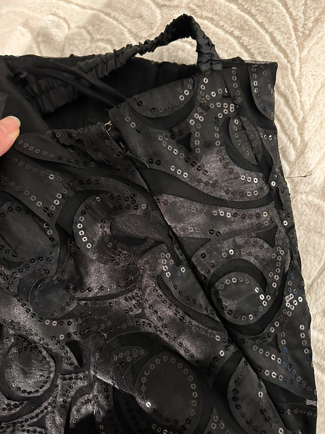 Charming Black strapless dress with a sequin swirl pattern. Mesh overlay and sequined detailing. Perfect for a night out!