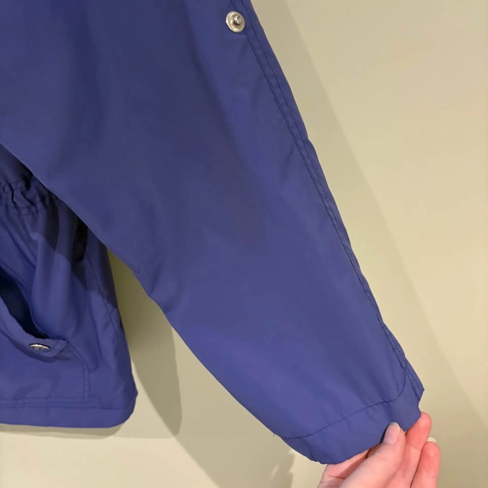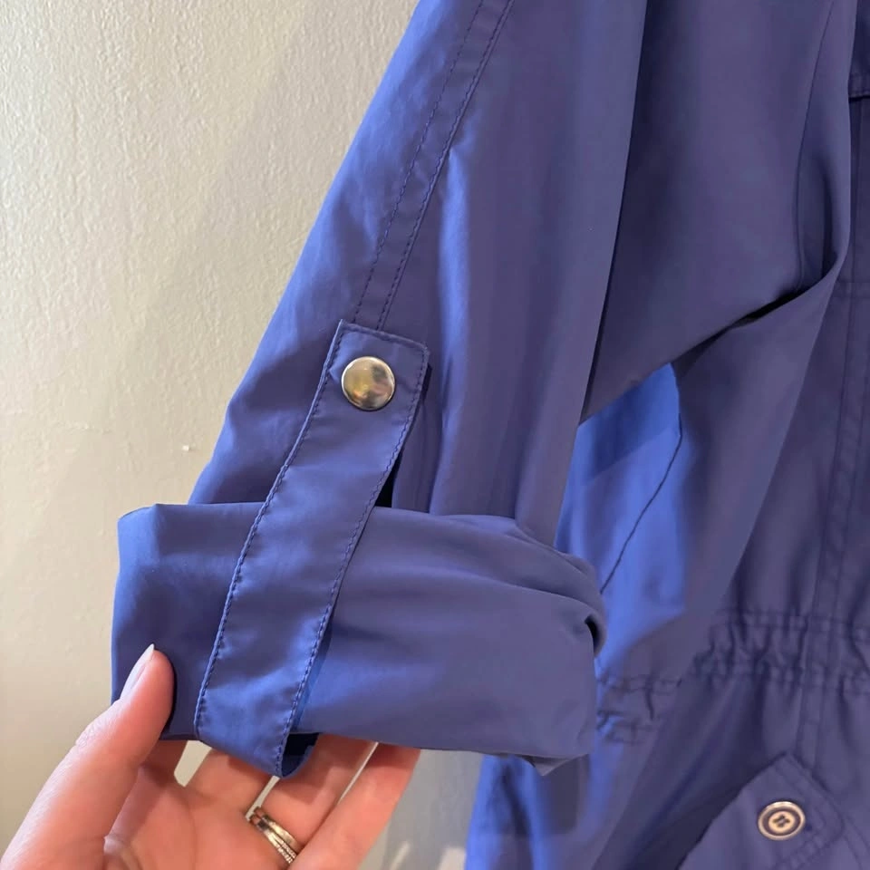 Chic utility jacket with a hood. Features multiple pockets and button details. Ideal for versatile styling. Sleeve can be rolled or left as a full sleeve as shown in photos. Size XL. Pit to pit 25.5”.