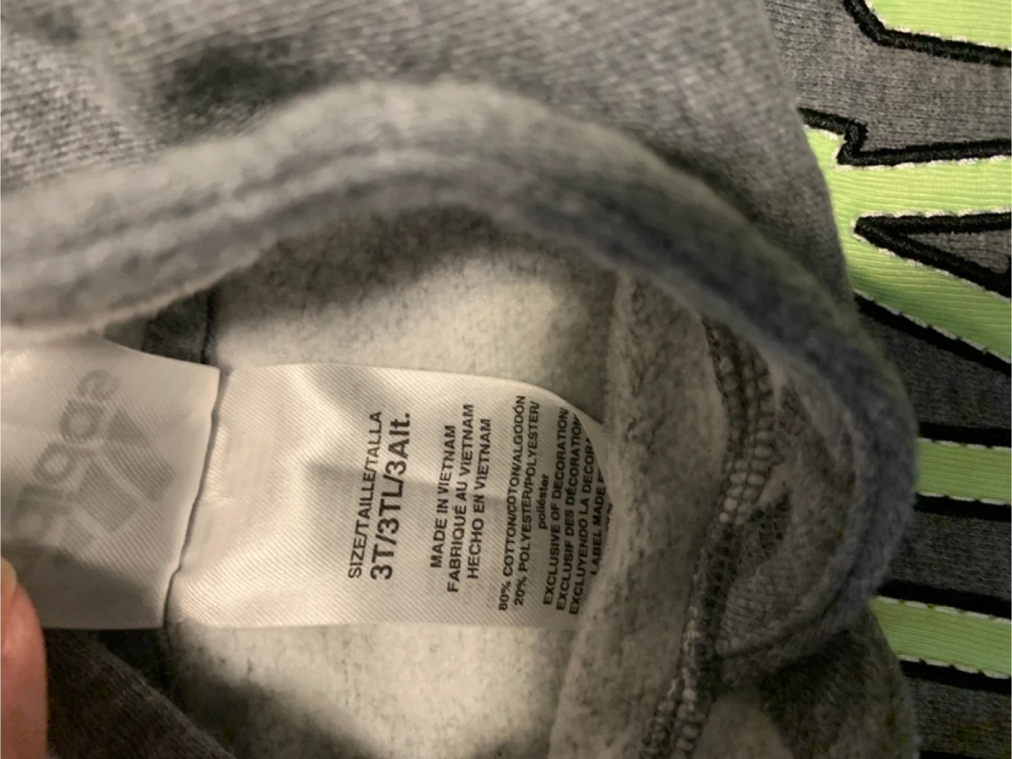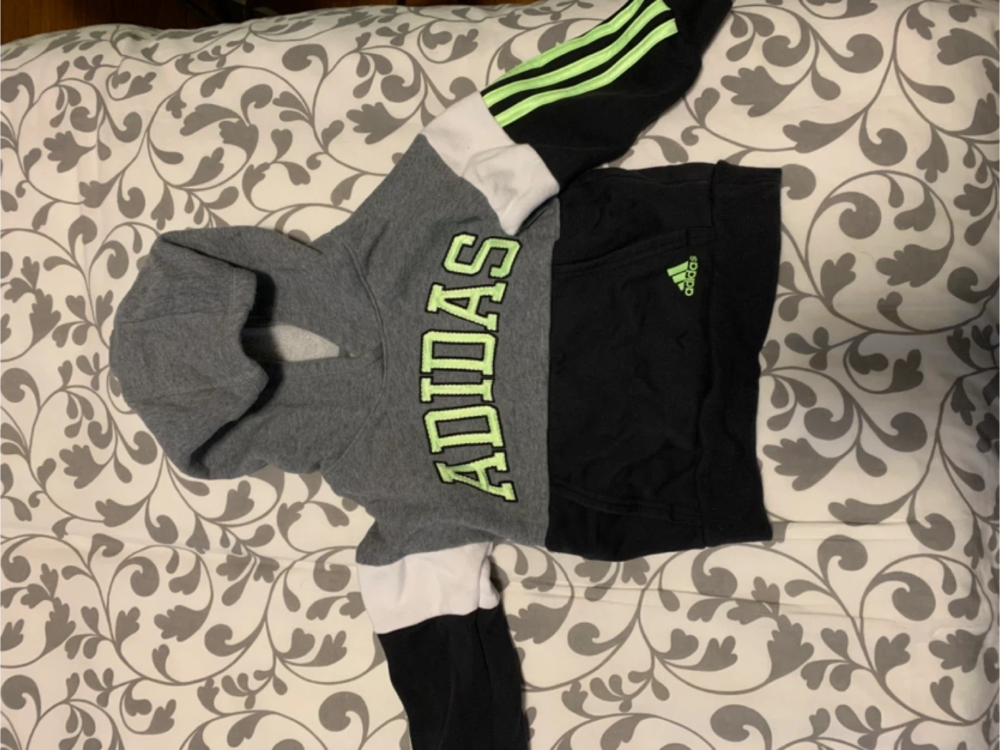 This is an Adidas hoodie and pants set in size 3T. The set is made of 80% cotton and 20% polyester. It features a grey hoodie with neon green accents and black pants.