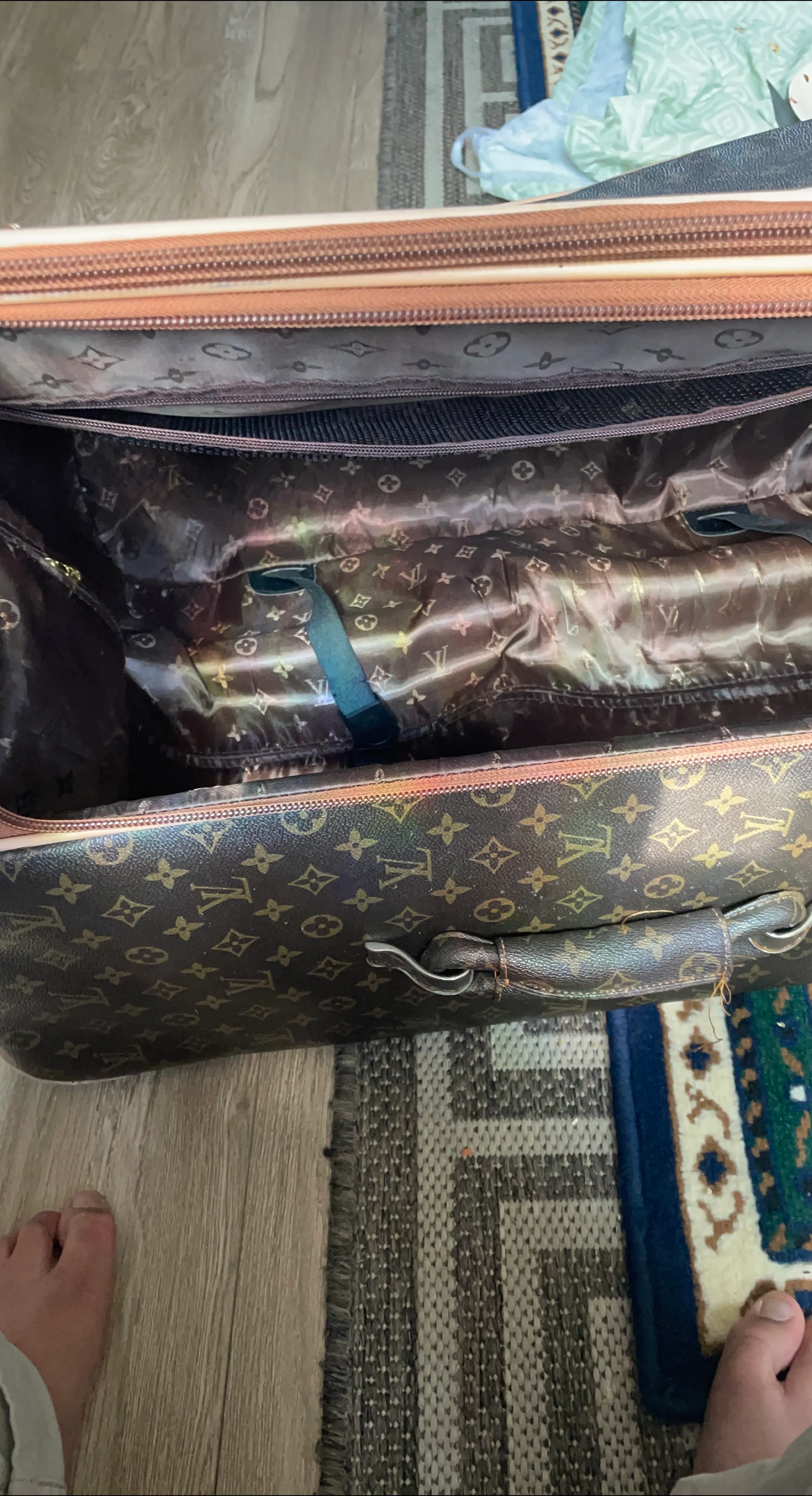 Vintage-style suitcase with a classic monogram pattern. It features a durable exterior and a spacious interior for all your travel needs. The interior lining has a glossy finish. This bag is perfect for weekend getaways!