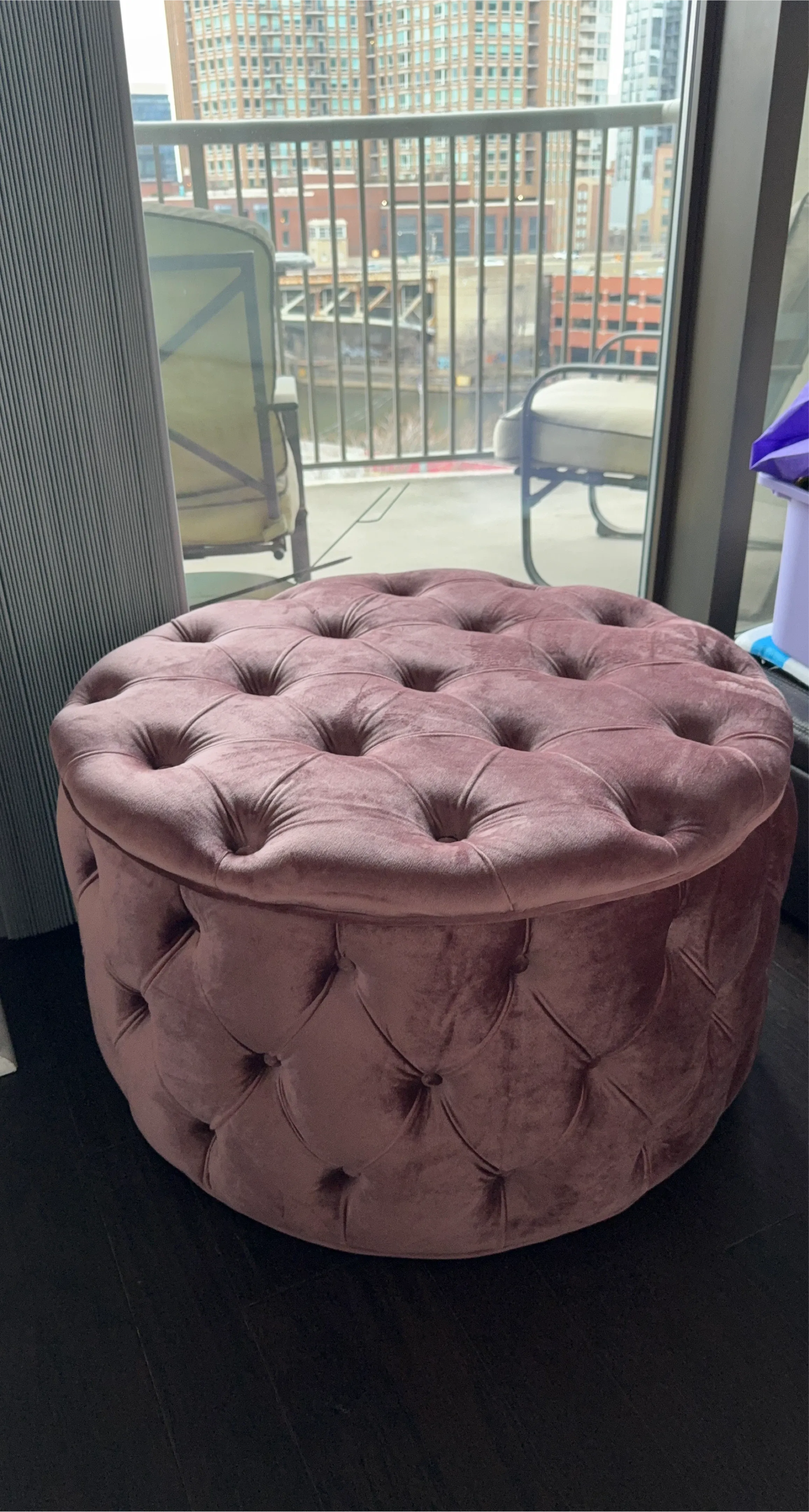 This round ottoman is upholstered in soft velvet with button tufting. It's perfect as a footrest. The dusty rose color adds a touch of elegance to any room! Dimensions 30” wide 17” high