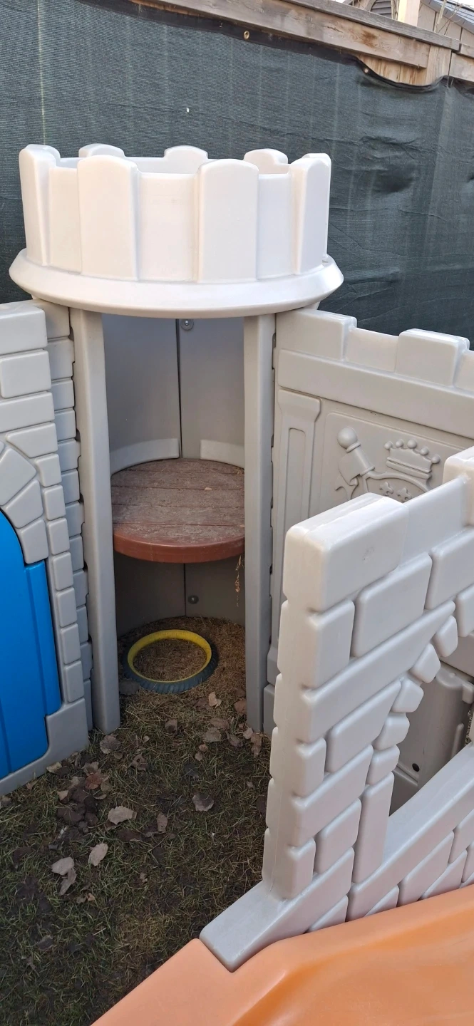 This Little Tikes castle climber is a fun outdoor playhouse for kids. It features a slide, a blue door with working latch, and multiple towers. Made of durable plastic for lasting outdoor fun!