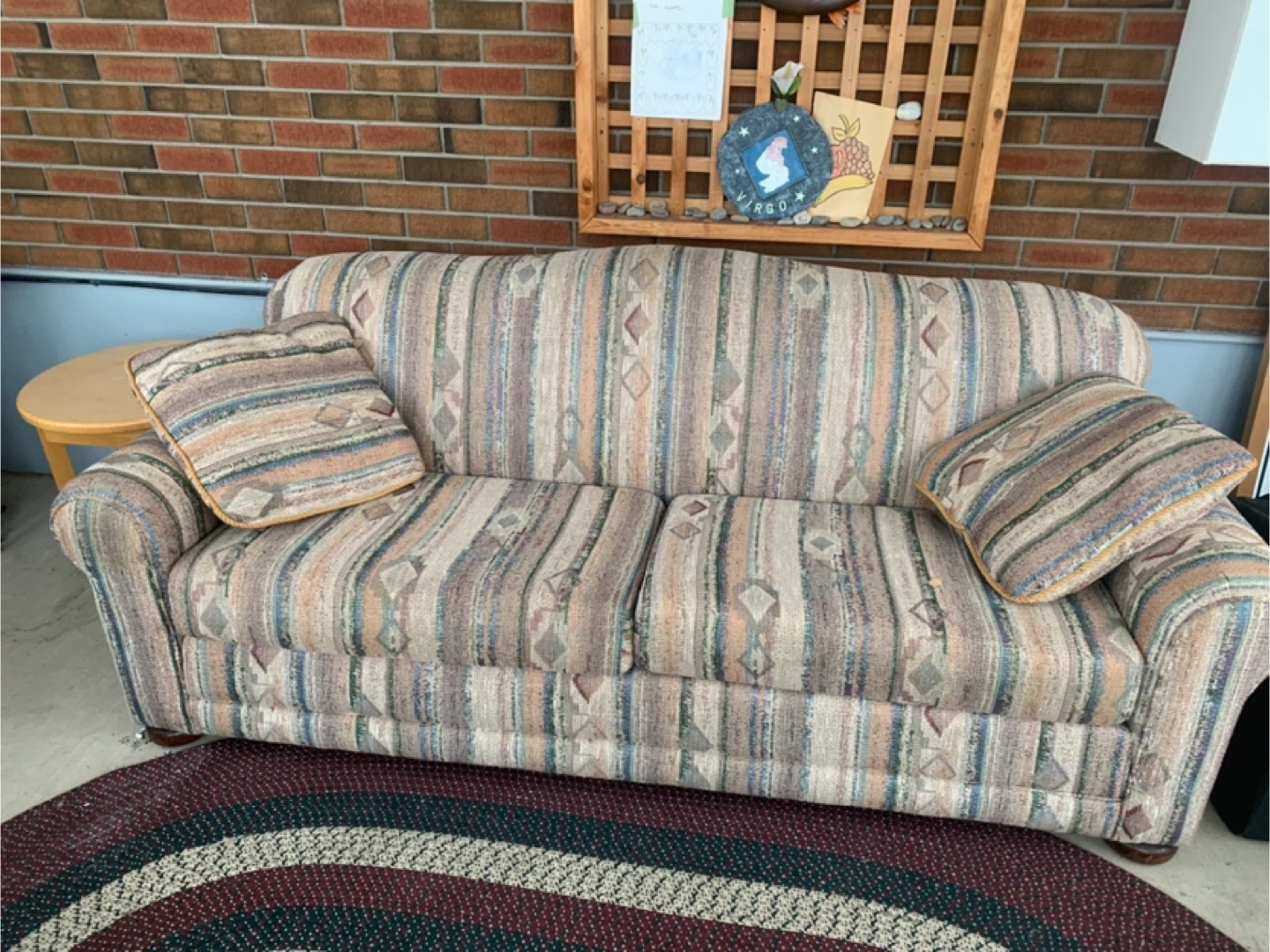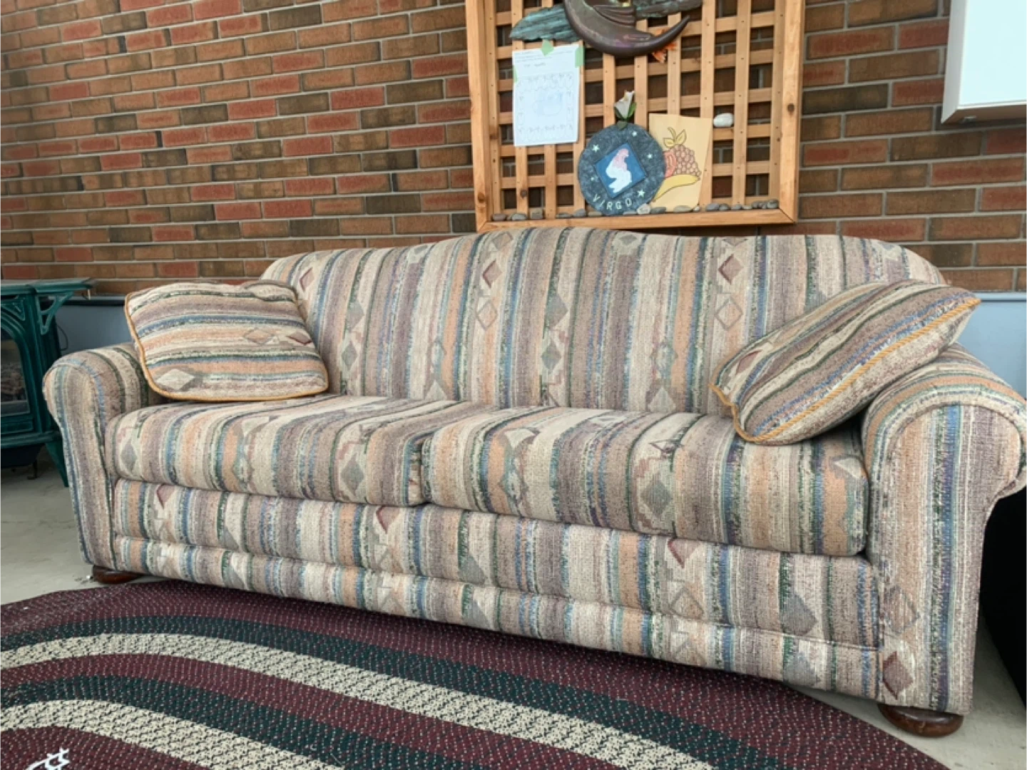 Comfortable two-cushion sofa with a multi-coloured striped and diamond patterned fabric. It comes with two throw pillows matching the sofa's upholstery. The upholstery is a durable fabric blend.