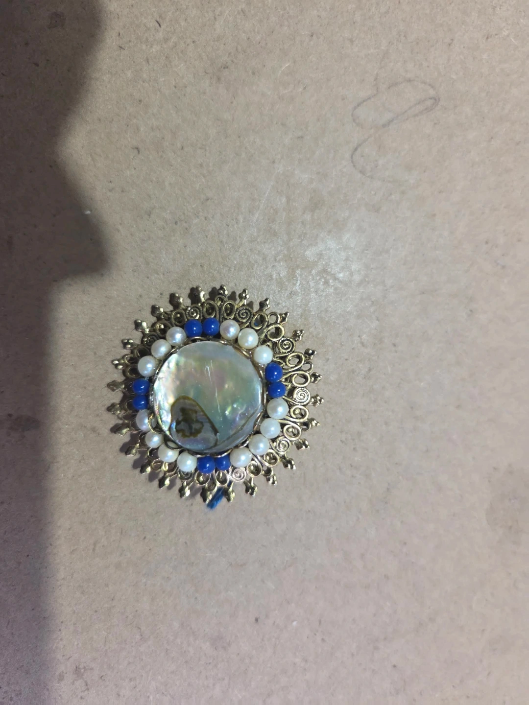 This is a decorative brooch featuring a central mother-of-pearl piece surrounded by white faux pearls and blue beads. It's crafted with gold-tone metal detailing.