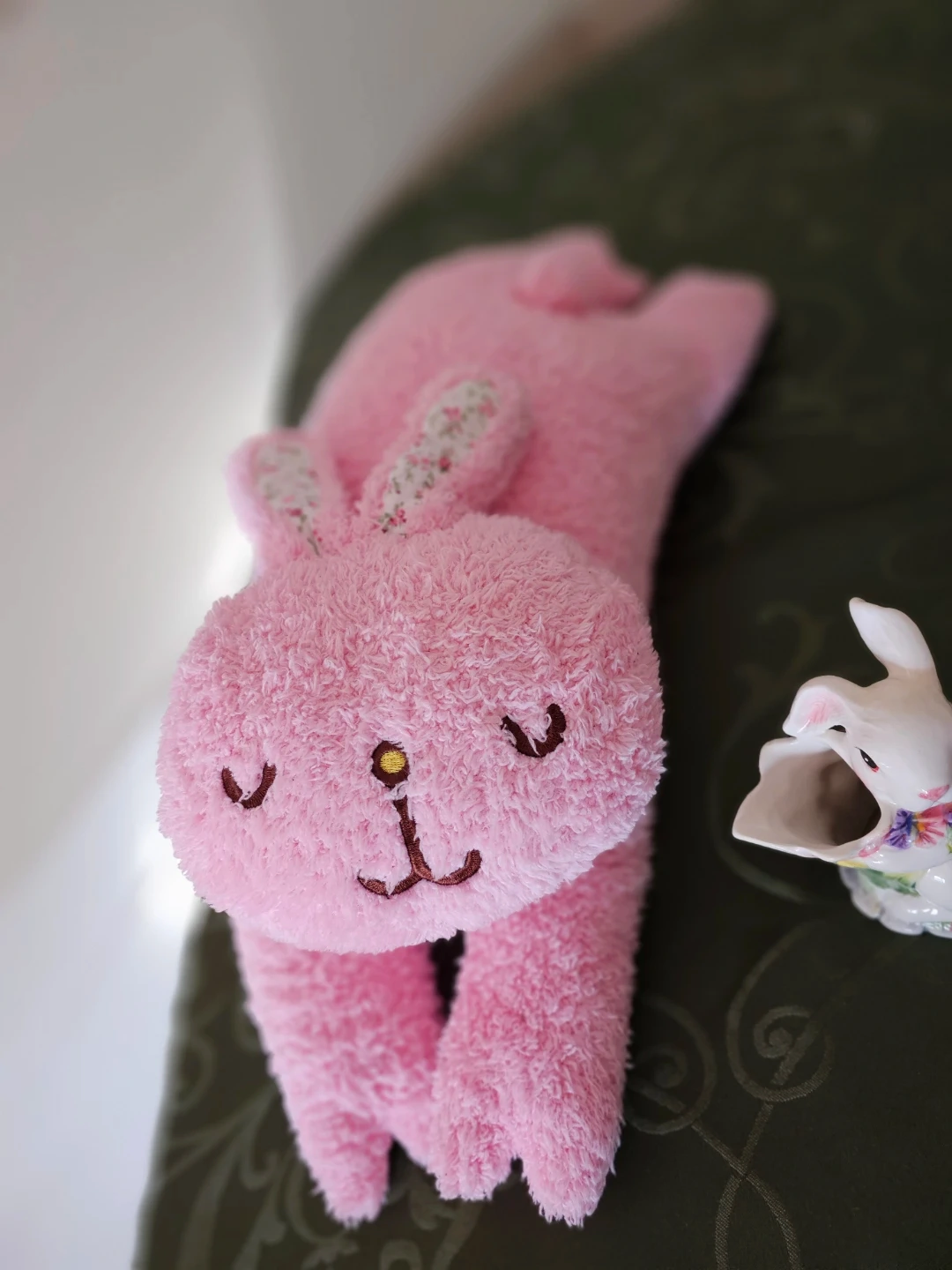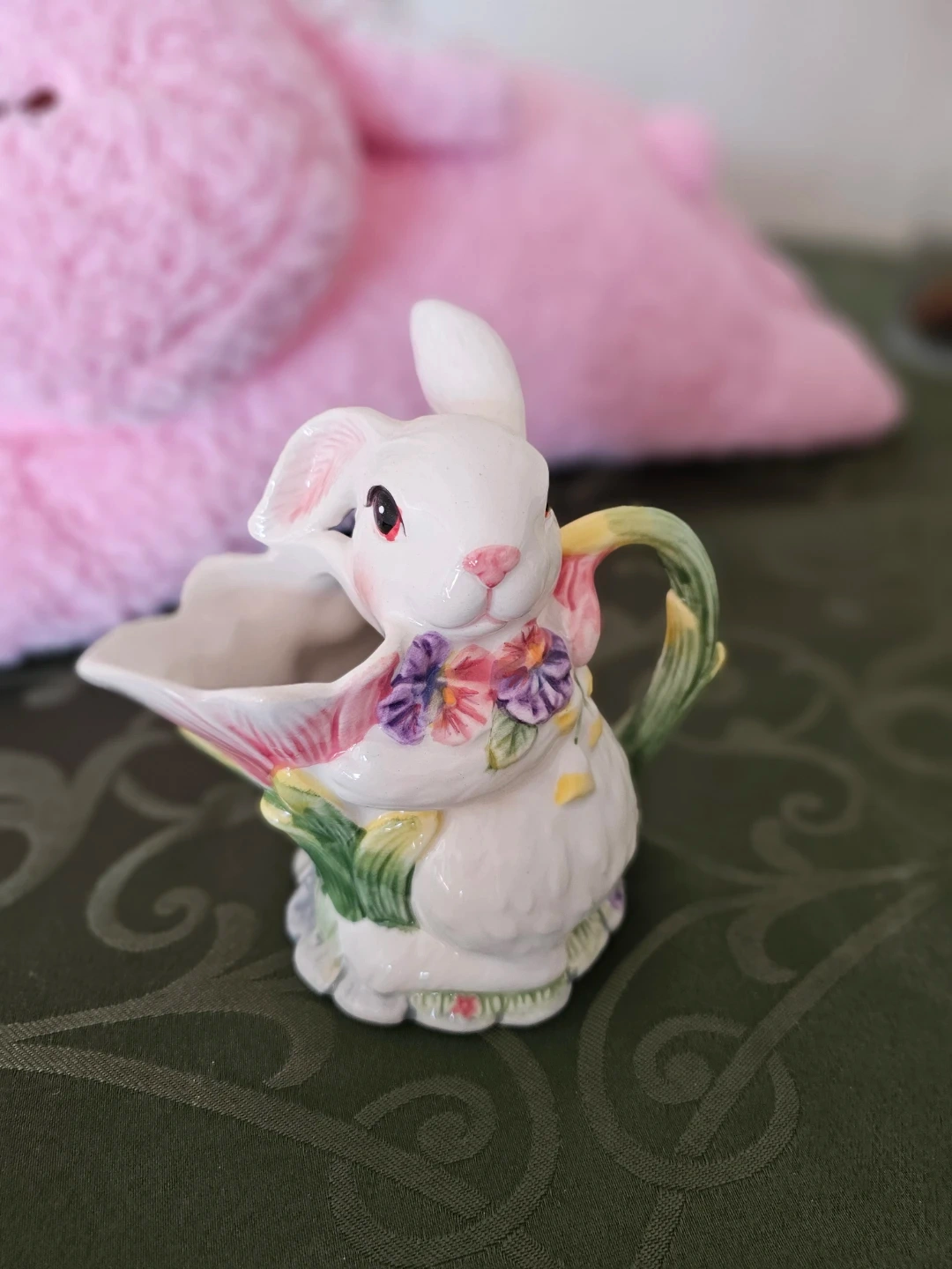 A cute pink plush bunny and a charming ceramic bunny creamer. The creamer is white with colourful floral accents and a handle shaped like a green stem. Perfect for Easter or spring decor!