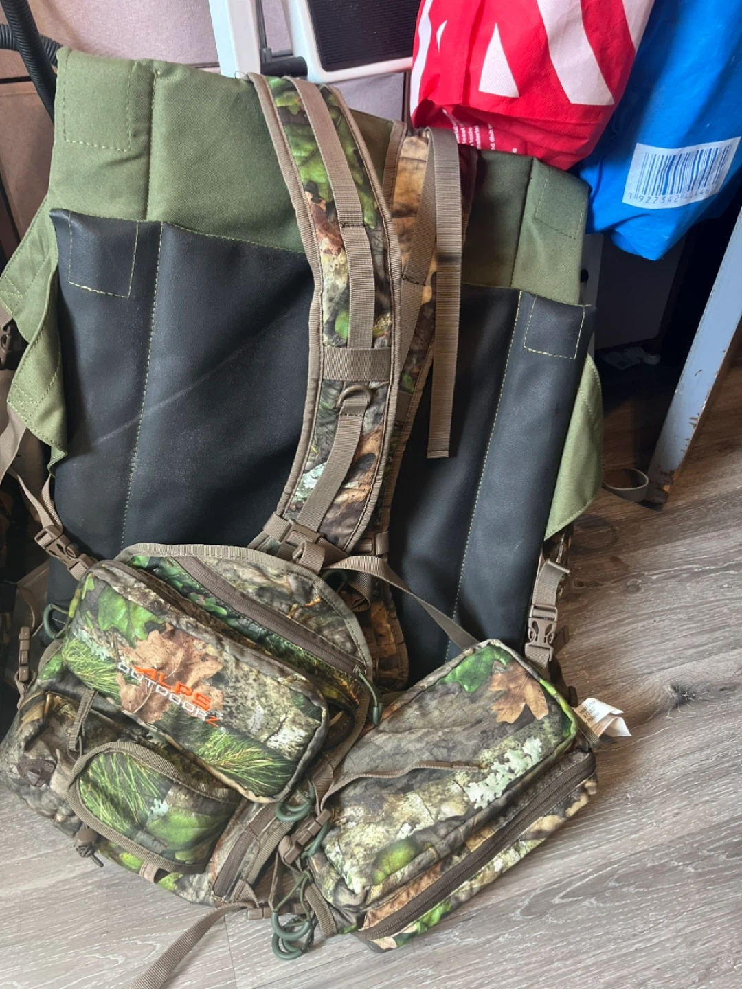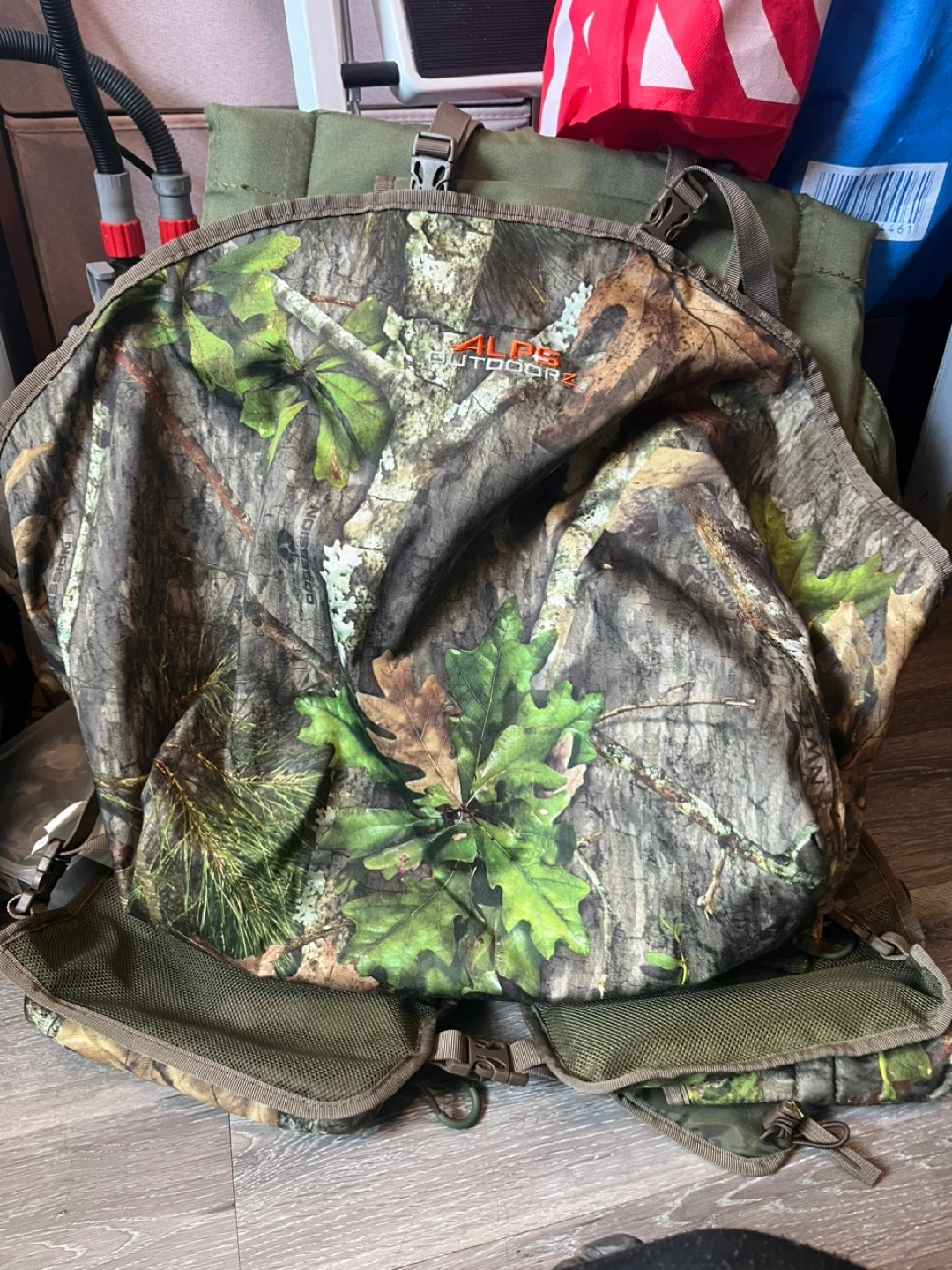 This ALPS OutdoorZ backpack features a camouflage pattern. It includes multiple pouches and adjustable straps. Durable design for outdoor use. Turkey hunting vest