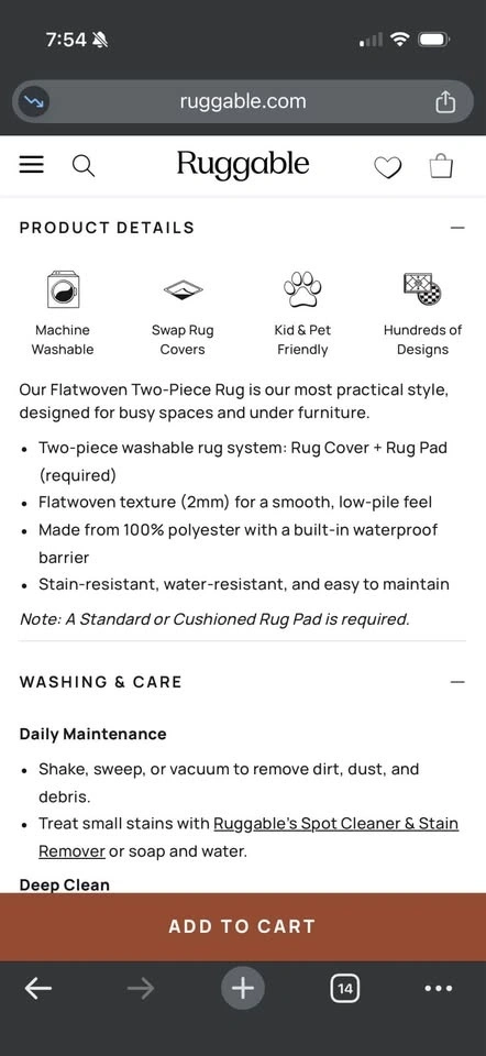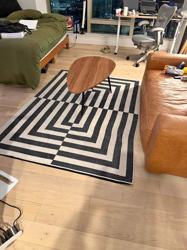 This 5'x7' rug is a versatile size for a living area or home office, fitting comfortably under a coffee table or desk. It features a two-piece system with a lightweight cover and a required rug pad. The cover is 100% machine washable, allowing for easy deep cleaning in any standard washer. With a low-pile, flatwoven texture of just 2mm, it is designed to be stain-resistant and easy to maintain. This makes it ideal for high-traffic spaces. Downtown Brooklyn pick up only.