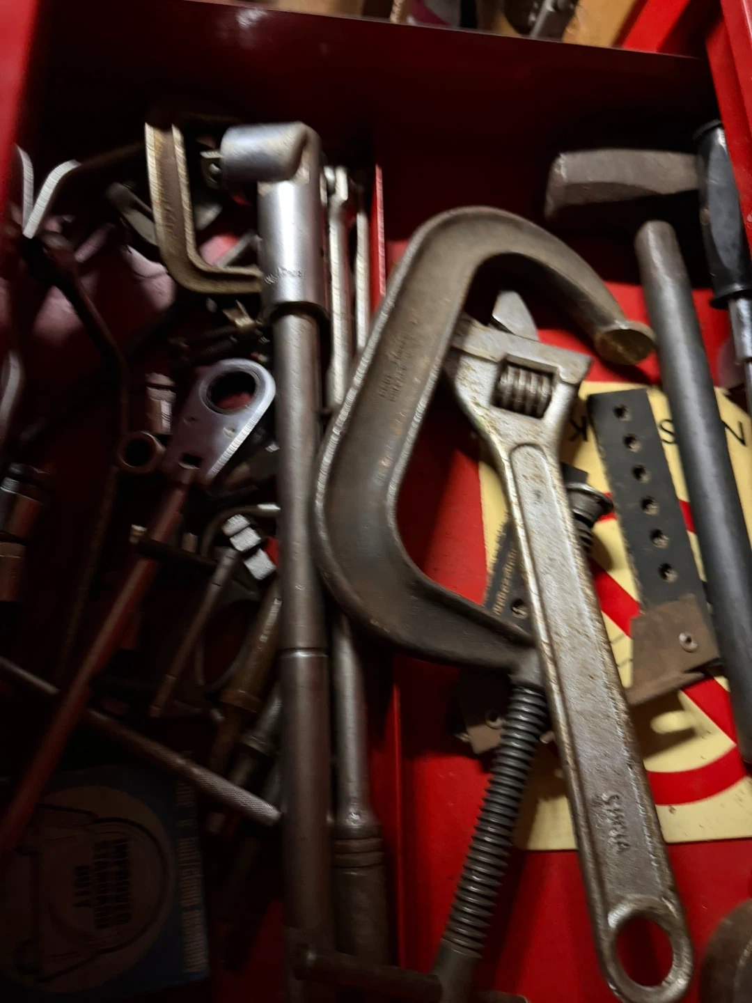 A collection of various tools including wrenches, pliers, a ratchet, and a saw. Many of these tools are made of metal for durability. This assortment is great for a home garage or workshop. Would like to see everything all together