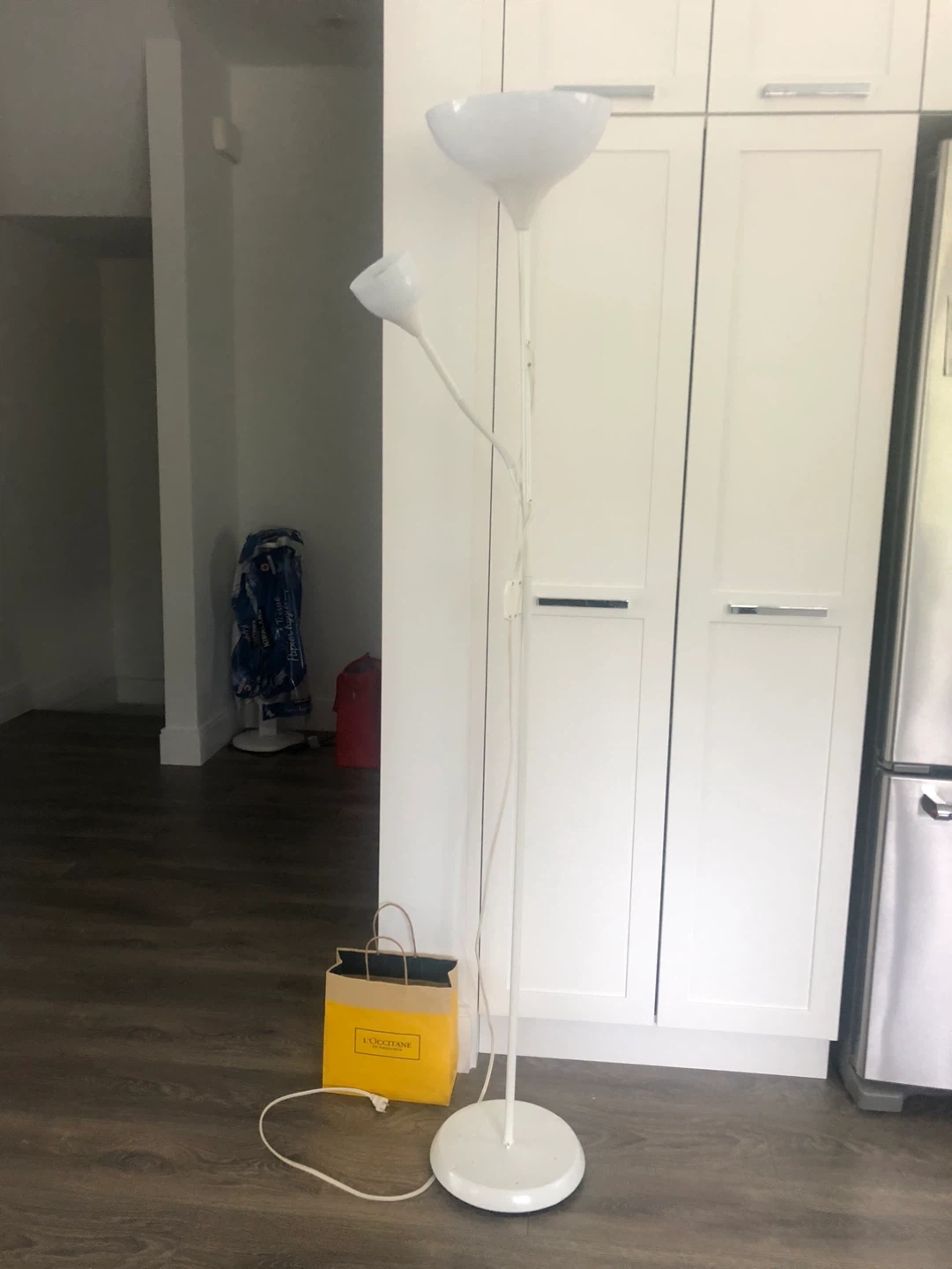 This is a white floor lamp with two adjustable heads. It has a stable round base and a simple on/off switch on the cord. The lamp provides versatile lighting for any room.