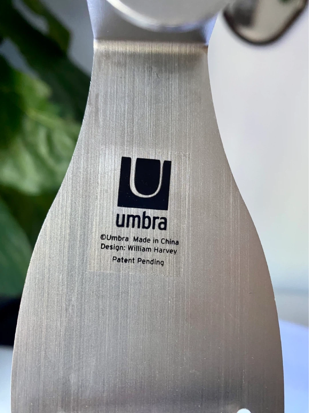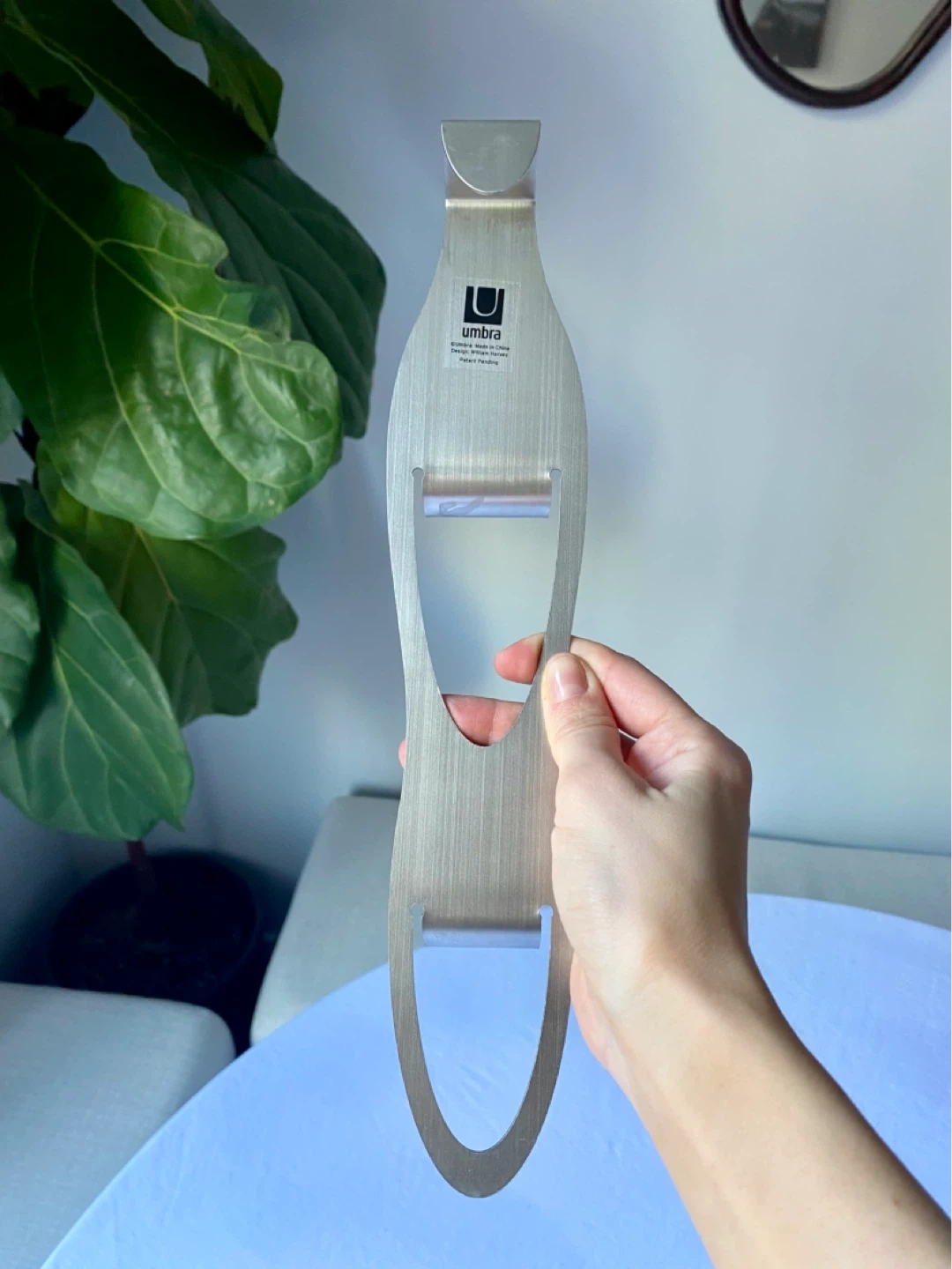 This discontinued Umbra hook rack is made of brushed metal. It's designed to hang over a door for extra storage. Useful for keeping frequently used items accessible! Designer is William Harvey (as stated on back of hook).