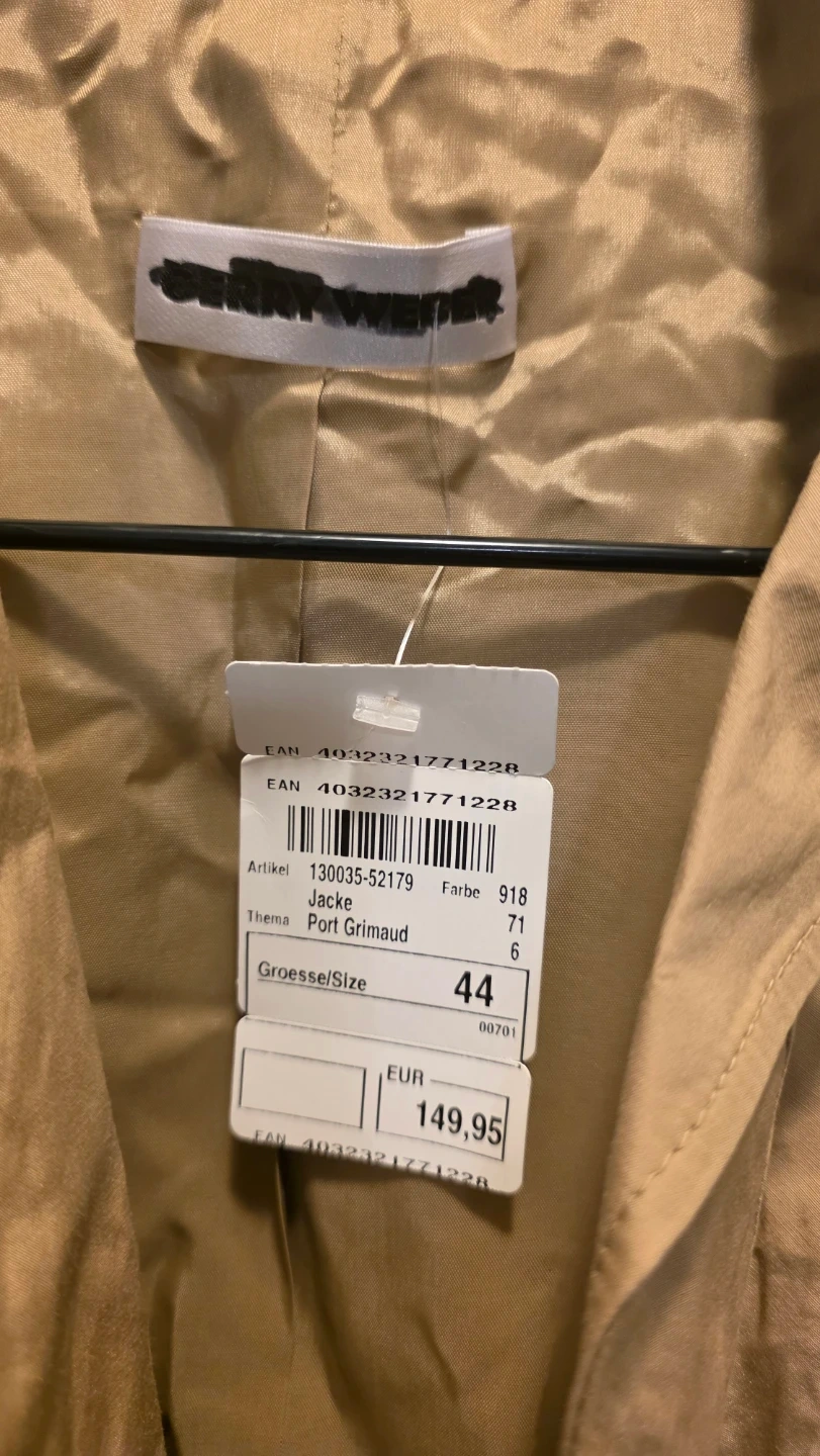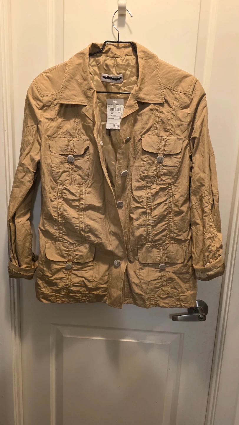 This tan jacket features a classic button-up style with multiple pockets. It's a size 44 and made from a lightweight fabric. Great for layering!