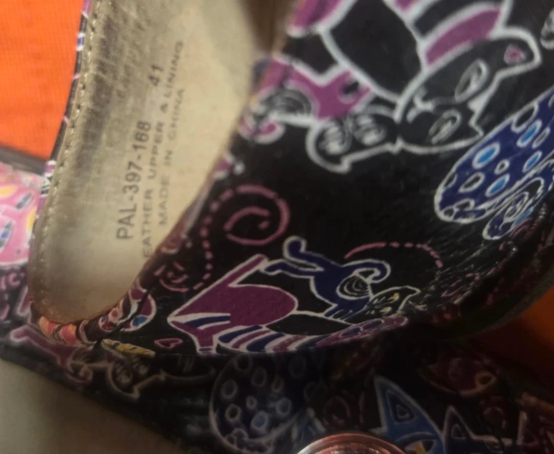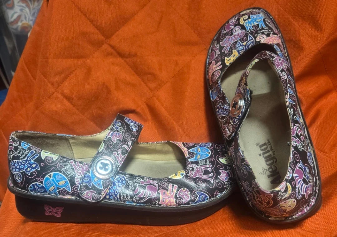 Alegria women's Mary Jane shoes with a fun, colourful print. These shoes are designed for comfort and support. Leather upper and lining. Made in China.