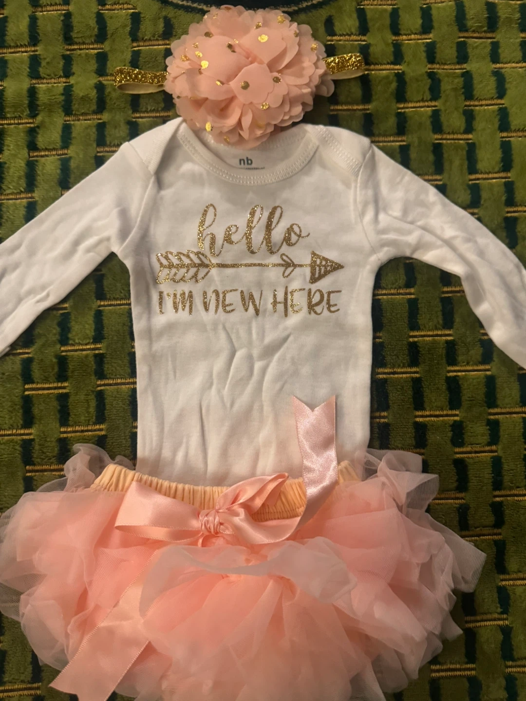This newborn baby girl outfit includes a onesie, tutu, and headband. The onesie has "hello I'M NEW HERE" written in gold glitter. The tutu is a soft peach colour with a satin ribbon bow.