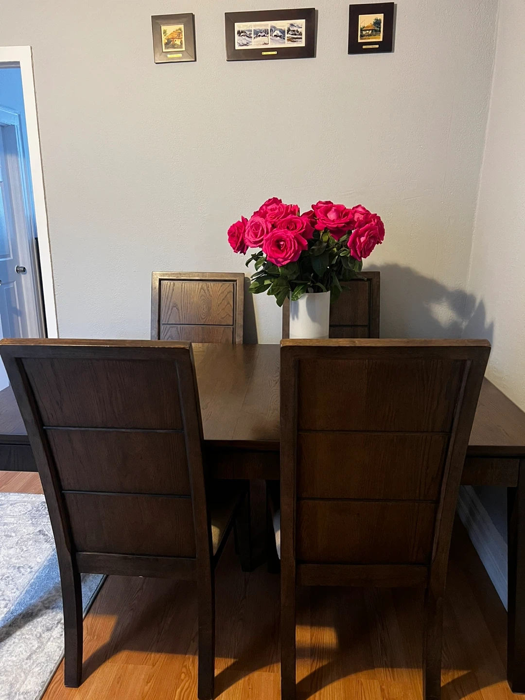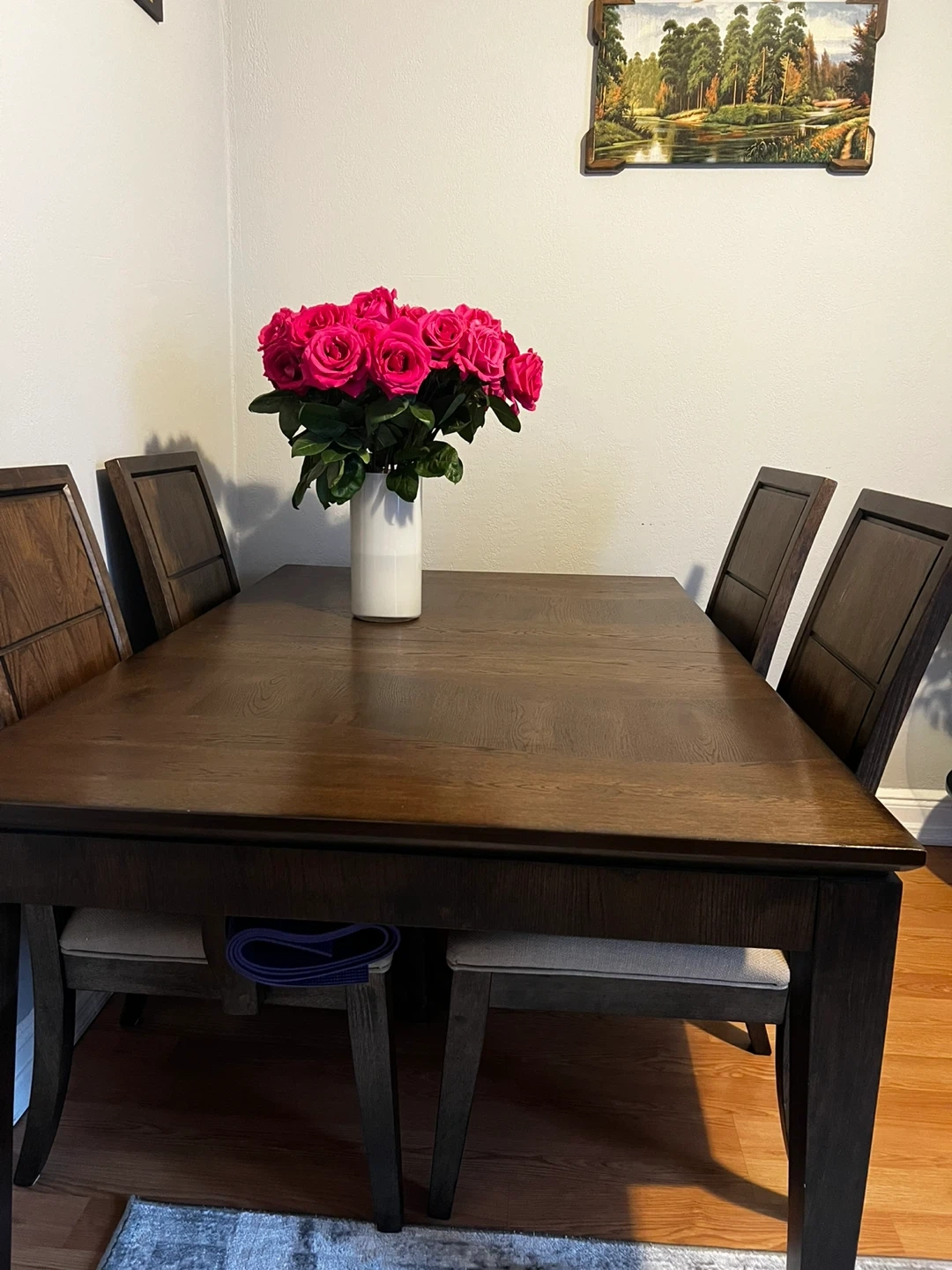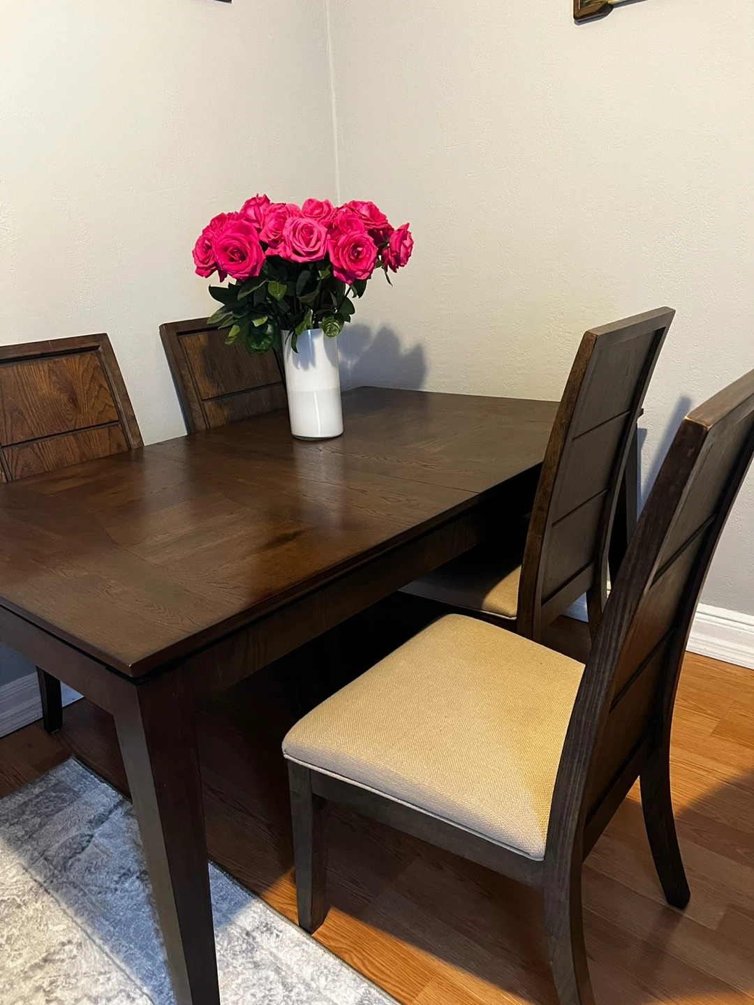 Selling a dining table with four chairs(used and dining table)2 extra chairs (brand new)The set is a dark wood color. The chairs have a light beige fabric seat. It's in good condition and ready for a new home!