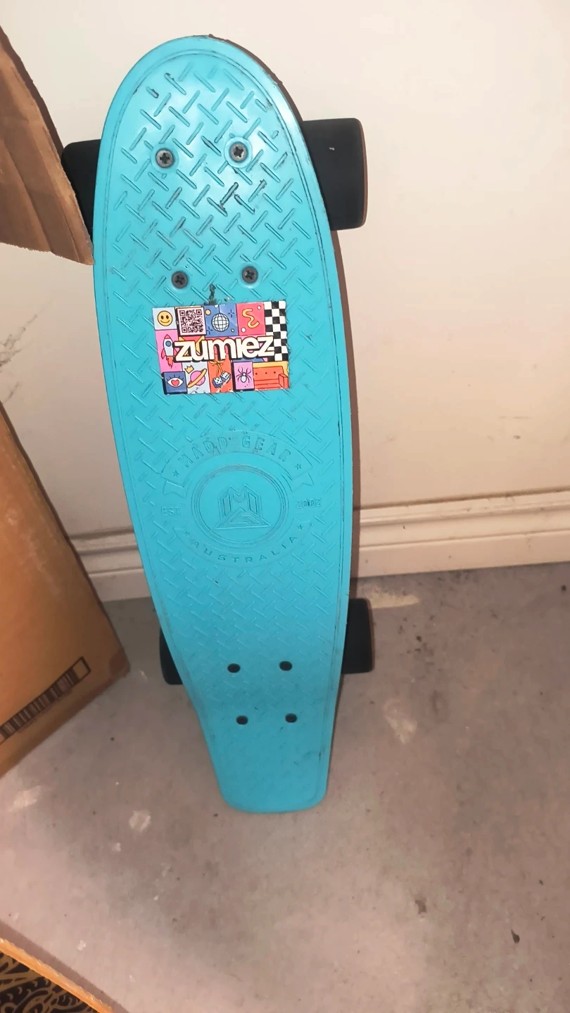 This is a bright blue penny board style skateboard. It has black hawgs wheels and trucks. Perfect for cruising around town!