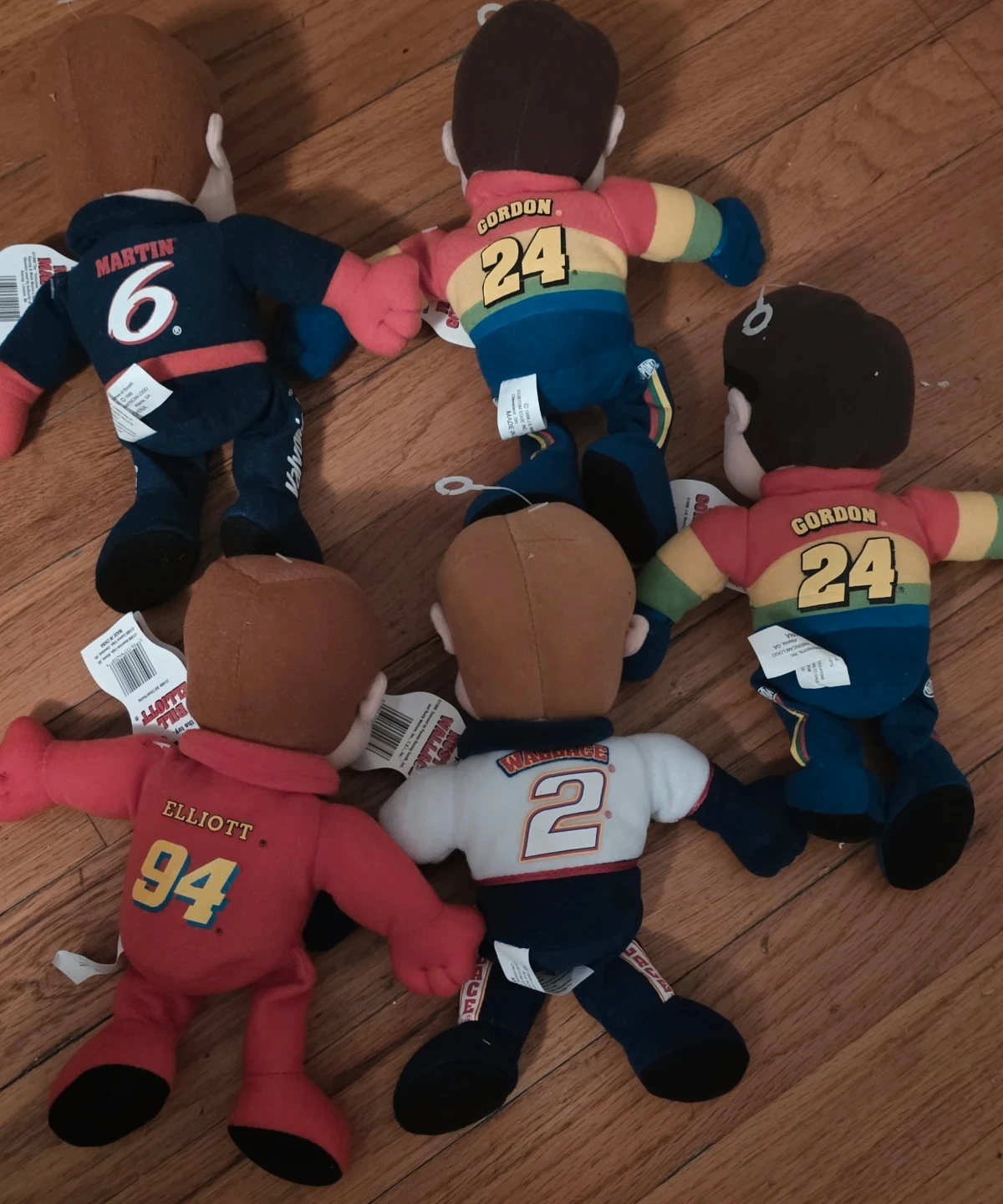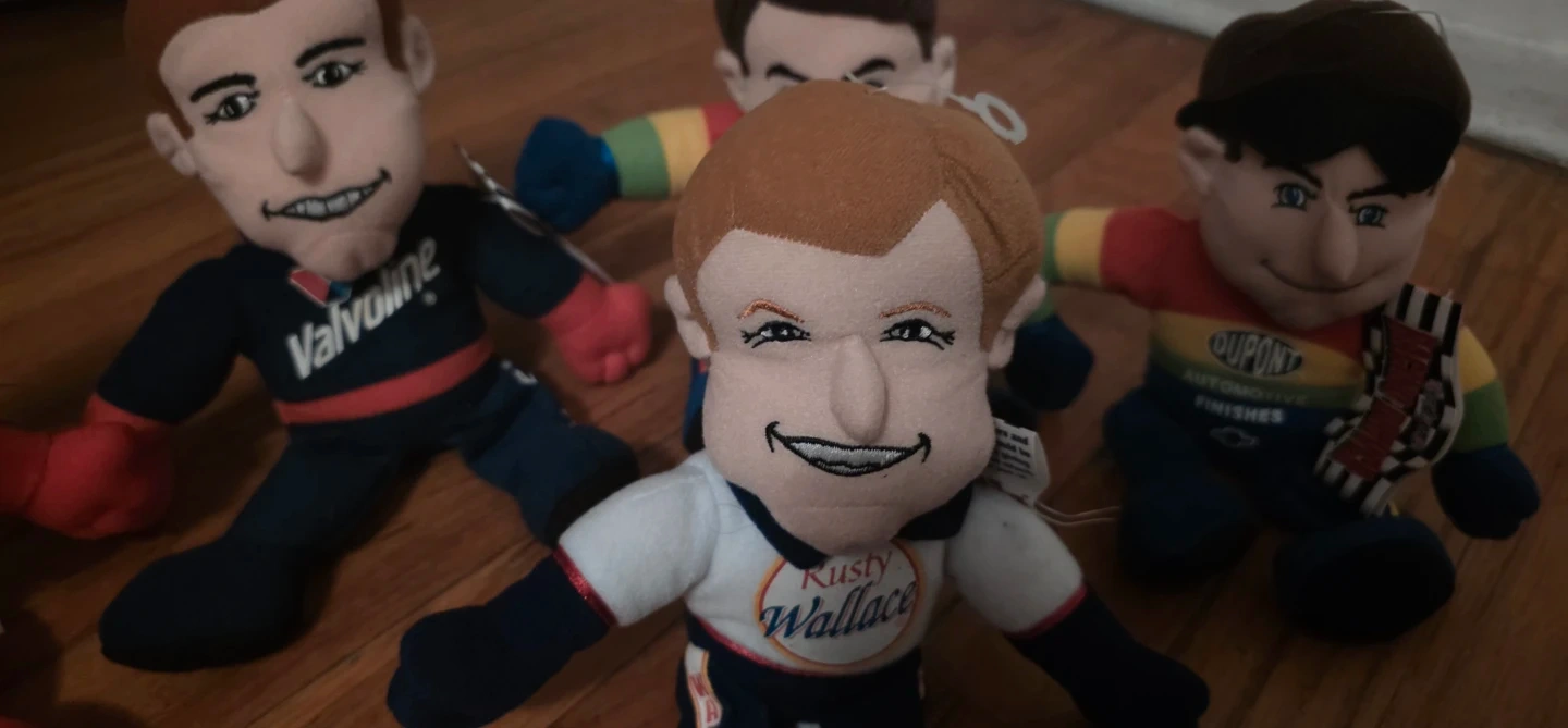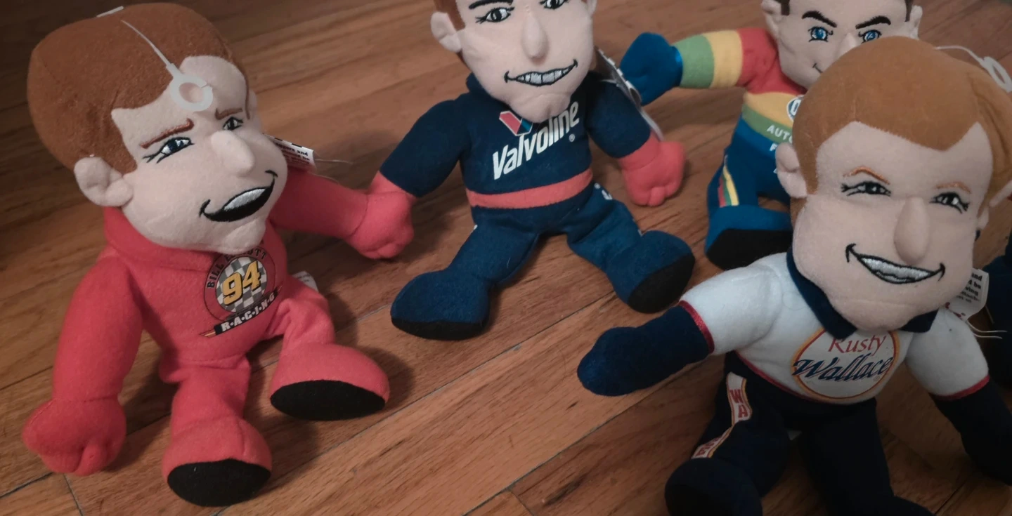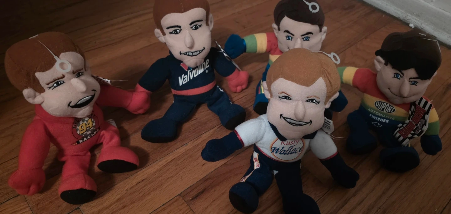 This set includes plush dolls of NASCAR drivers: Rusty Wallace, Jeff Gordon, Bill Elliott, Mark Martin, and another of Jeff Gordon. They're all soft and collectible. Great for any NASCAR fan!
