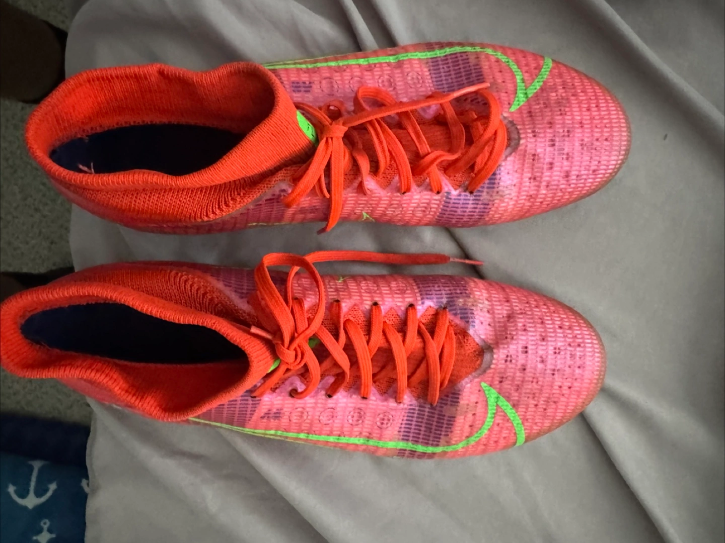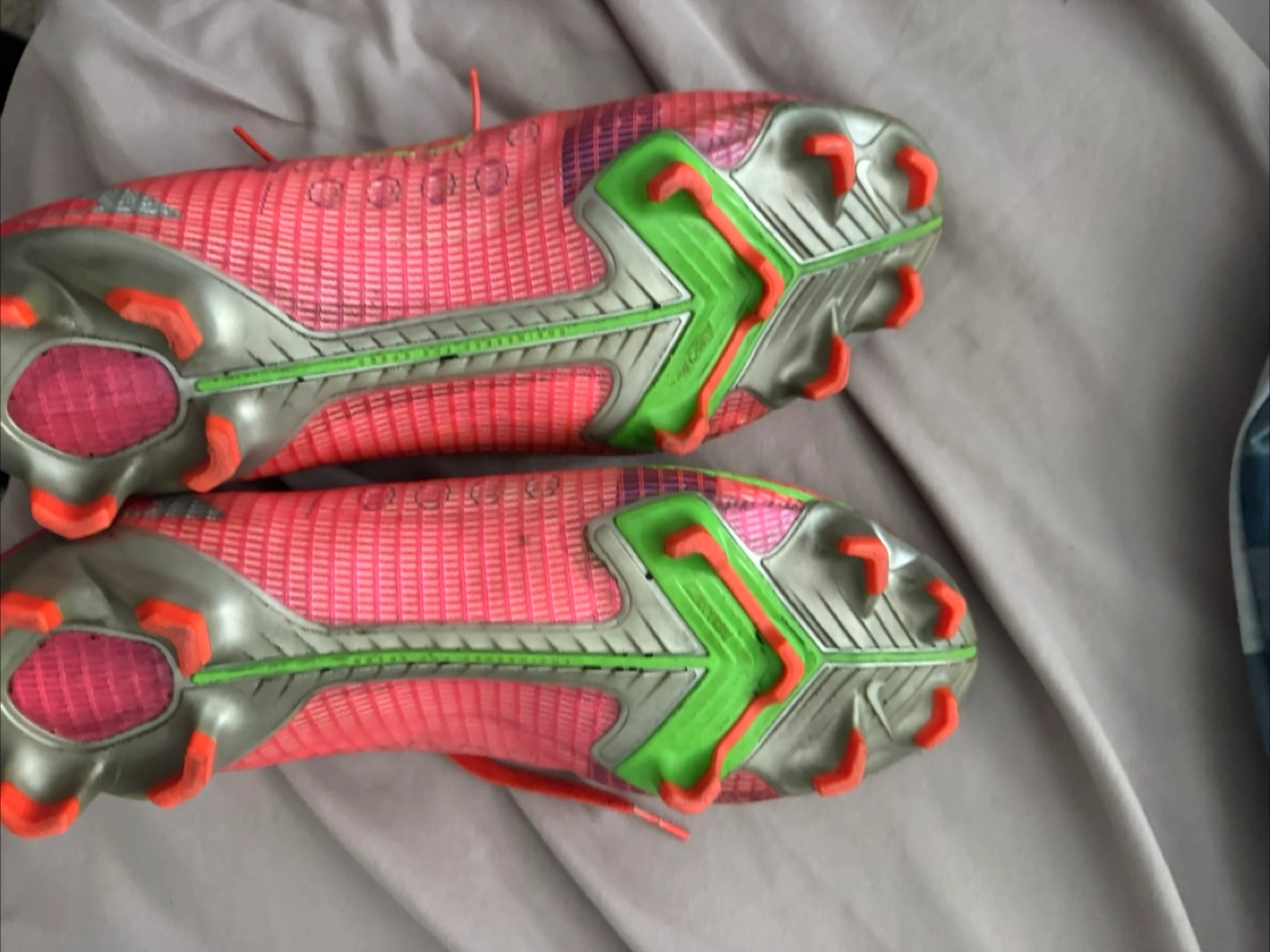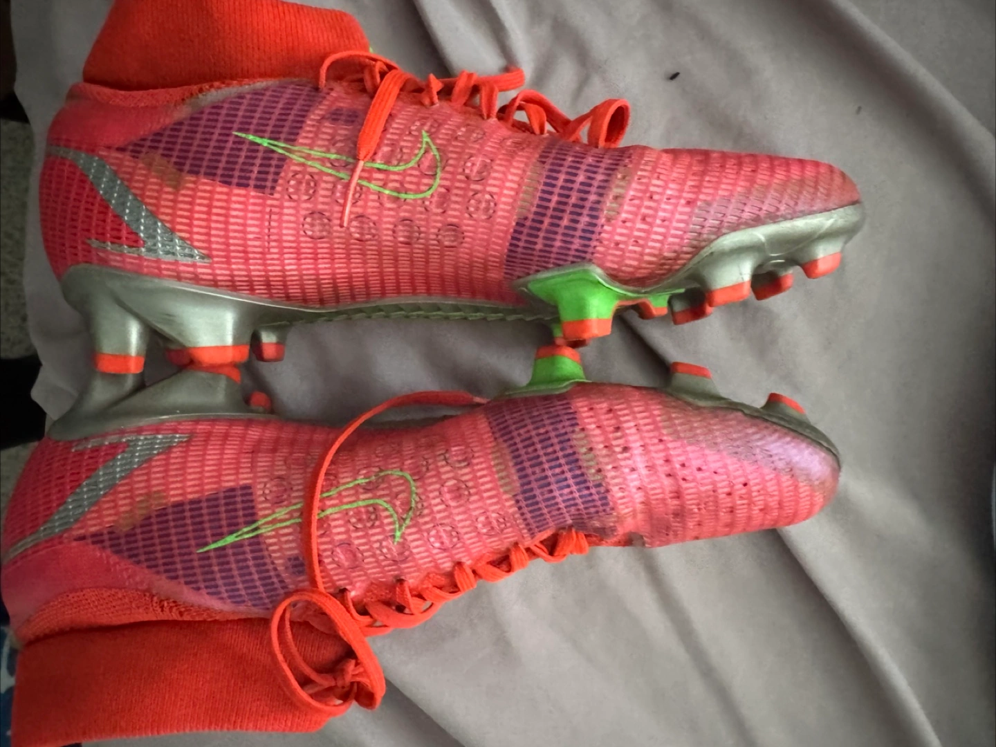 Used Nike Mercurial Vapor 14 Elite FG soccer cleats. Red and pink colourway. High-top design. Firm ground studs. Good condition.