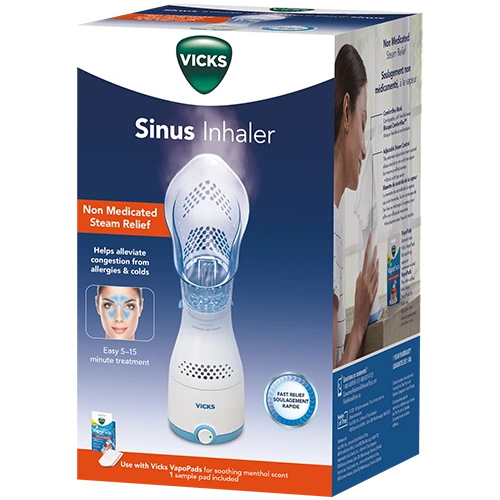 About this item: Vicks Sinus Inhaler helps provide symptomatic relief from cough and congestion caused by colds, seasonal allergies, and sinusitis. Soothing steam targets the nose, mouth and throat to help naturally alleviate congestion, dryness and irritation.