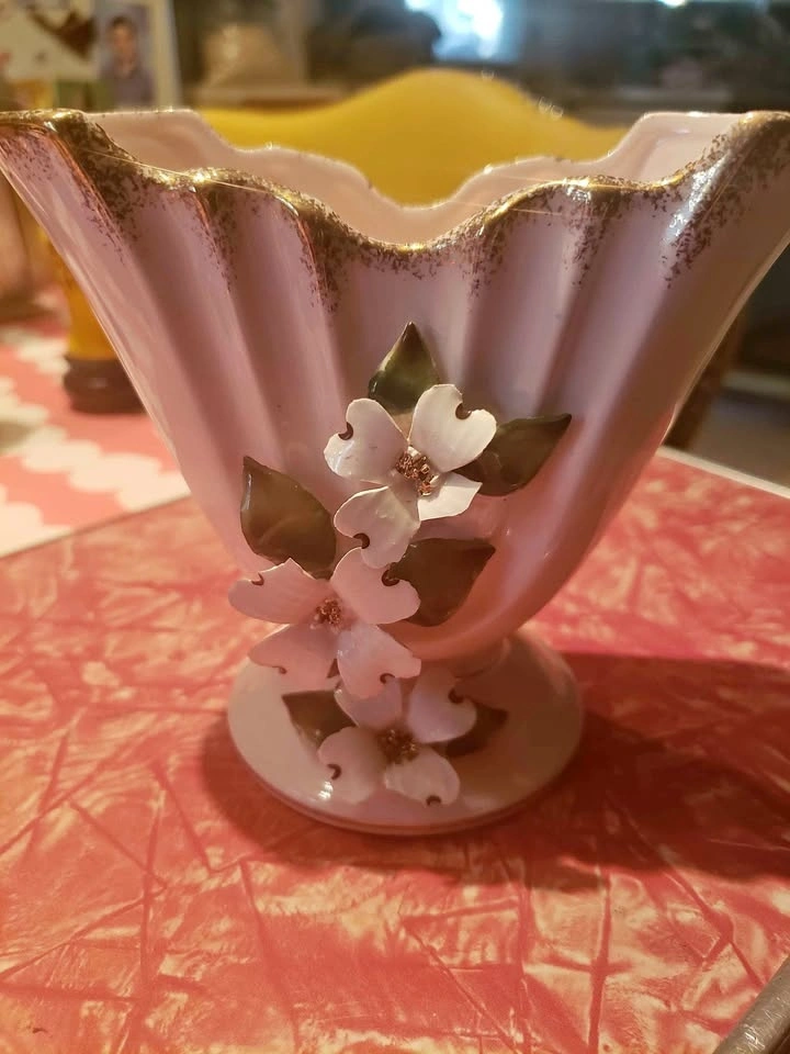 Chinoserie style porcelain vase, likely from the 1940s, made in Japan. Resembles Lefton Dogwood vases from the same era. No maker's mark. The leaves and Dogwood flowers are 3D and delicate. Some petals have small chips, but they are hard to notice. The price reflects this. Otherwise, condition is very good with no other chips or cracks. It's just under 5 inches tall and about 5.5 inches wide at the top. Features speckled gold leaf paint around the rim. A lovely vintage antique style piece in pale pink with white and gold flowers and green leaves. Pick up in Upper Lonsdale, North Vancouver.
