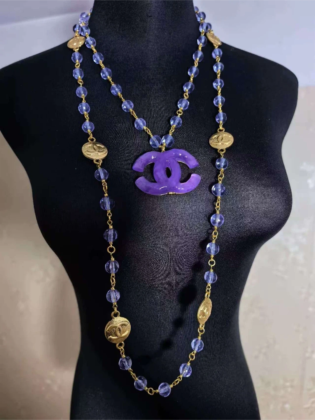 This double-strand necklace features clear blue beads with gold-tone accents. It showcases a prominent purple CC logo pendant.