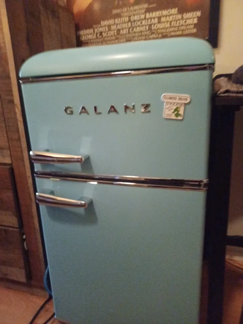 This is a light blue Galanz mini fridge with a retro design. It features chrome accents and handles. The fridge is compact and perfect for small spaces. It's an excellent addition for dorm rooms or offices!