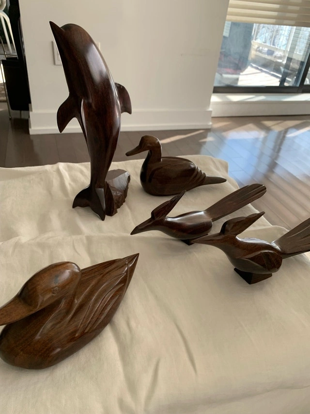 I'm offering a set of ironwood sculptures from the Dominican Republic, dating back to approximately 1980. These used carvings showcase the natural beauty and unique craftsmanship of Dominican artisans from that era. A dolphin, ducks and other birds comprise the set. Perfect for collectors or anyone who appreciates unique decor. Given that these pieces have journeyed through time, they carry subtle signs of their age, which only adds to their story and charm. But don't worry, they are still the works of art they were always meant to be! If the ad is up, yes, they are still available! Cash accepted.