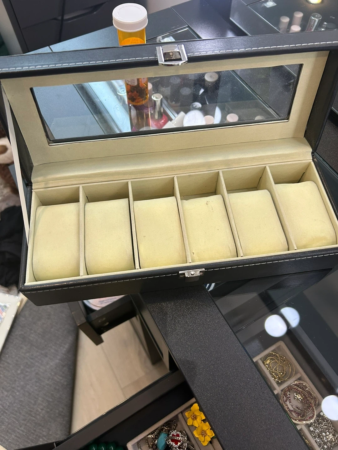 Black faux leather watch display case with a clear glass lid. It has 6 individual compartments with soft cushions to hold watches. The clasp closure keeps everything secure. It's a handy way to store your watch collection!