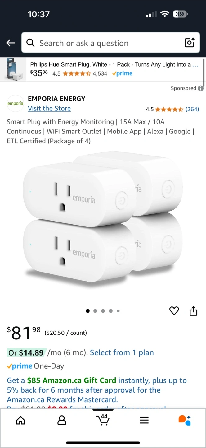 Smart Plug with Energy Monitoring | 15A Max / 10A Continuous | WiFi Smart Outlet | Mobile App | Alexa | Google | ETL Certified (Package of 4)