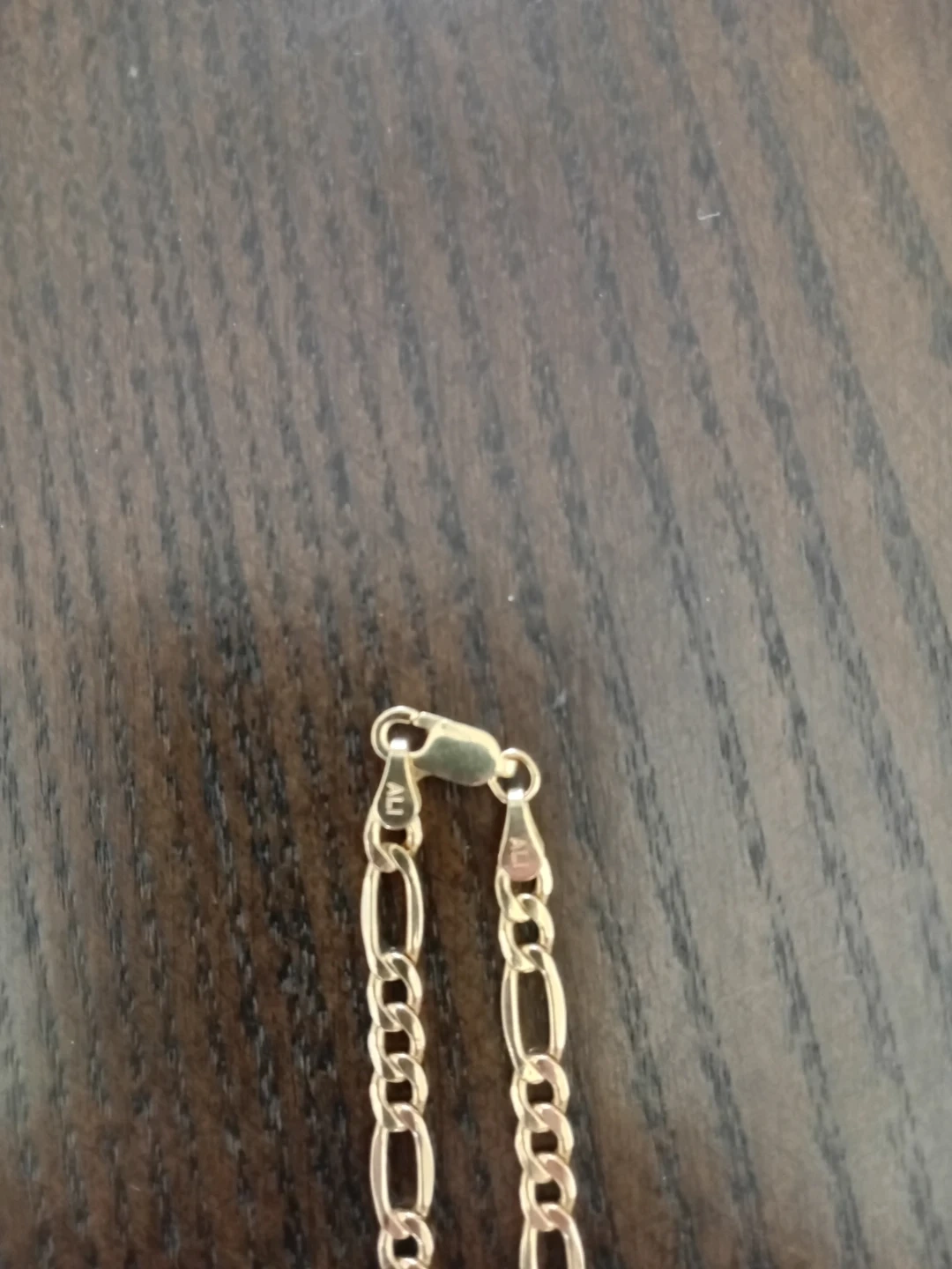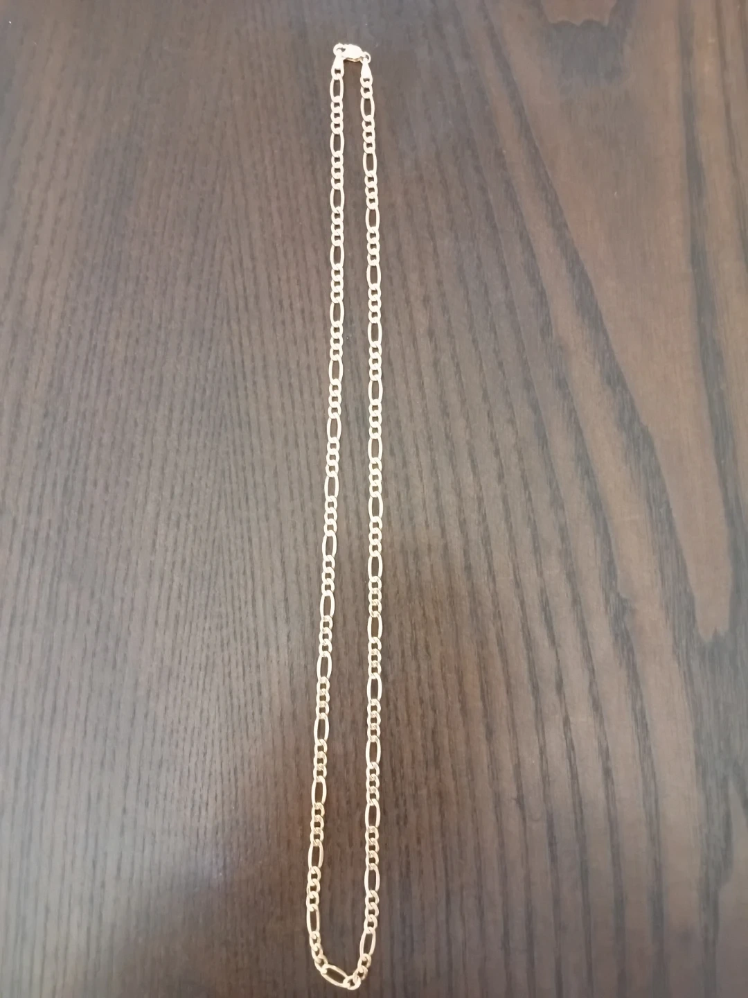 A classic 10k gold Figaro chain necklace. It's 20 inches long with a lobster clasp. This necklace adds a touch of elegance to any outfit.