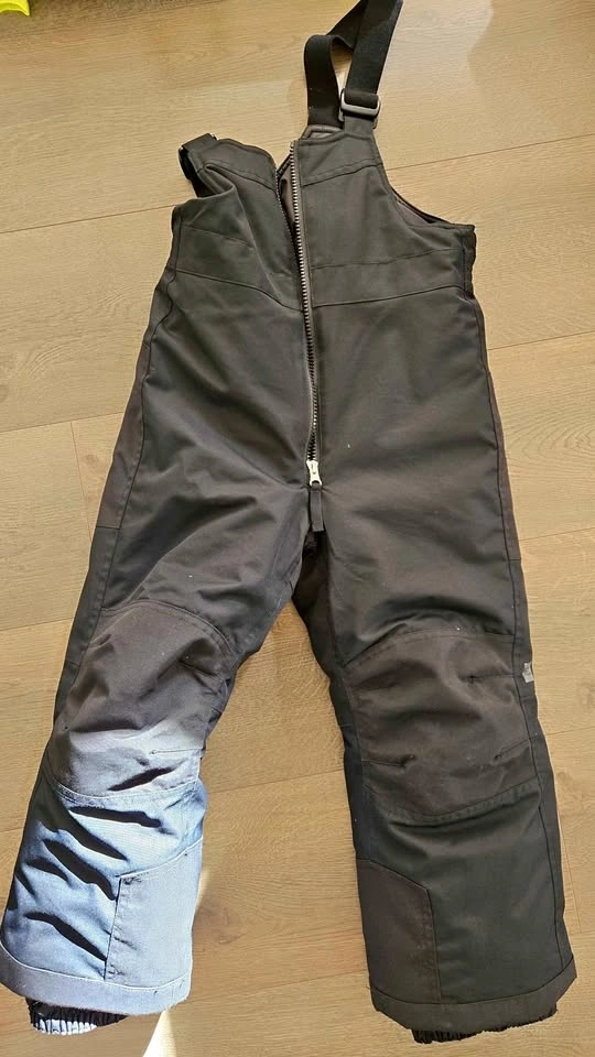Warm MEC snow bibs for kids. Black color with adjustable straps and a front zipper. Size Child 5. Great for playing in the snow or ski trips.