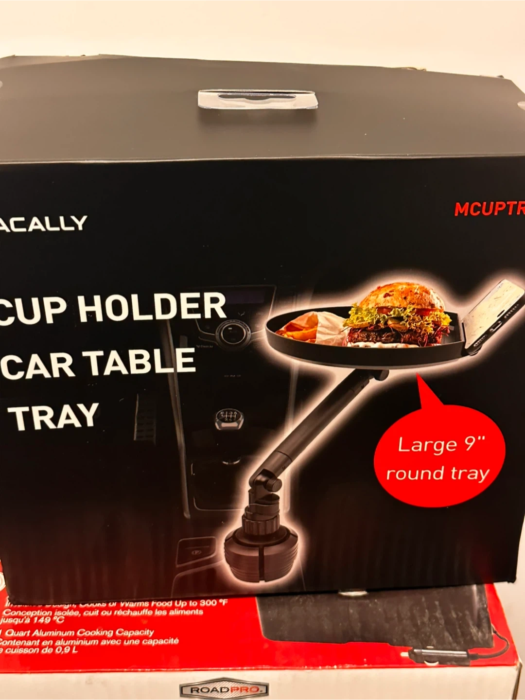 This car table tray fits into your cup holder and has a large 9" round tray . It’s brand new still intact in the box . Purchased from Amazon for $ 99 + tax