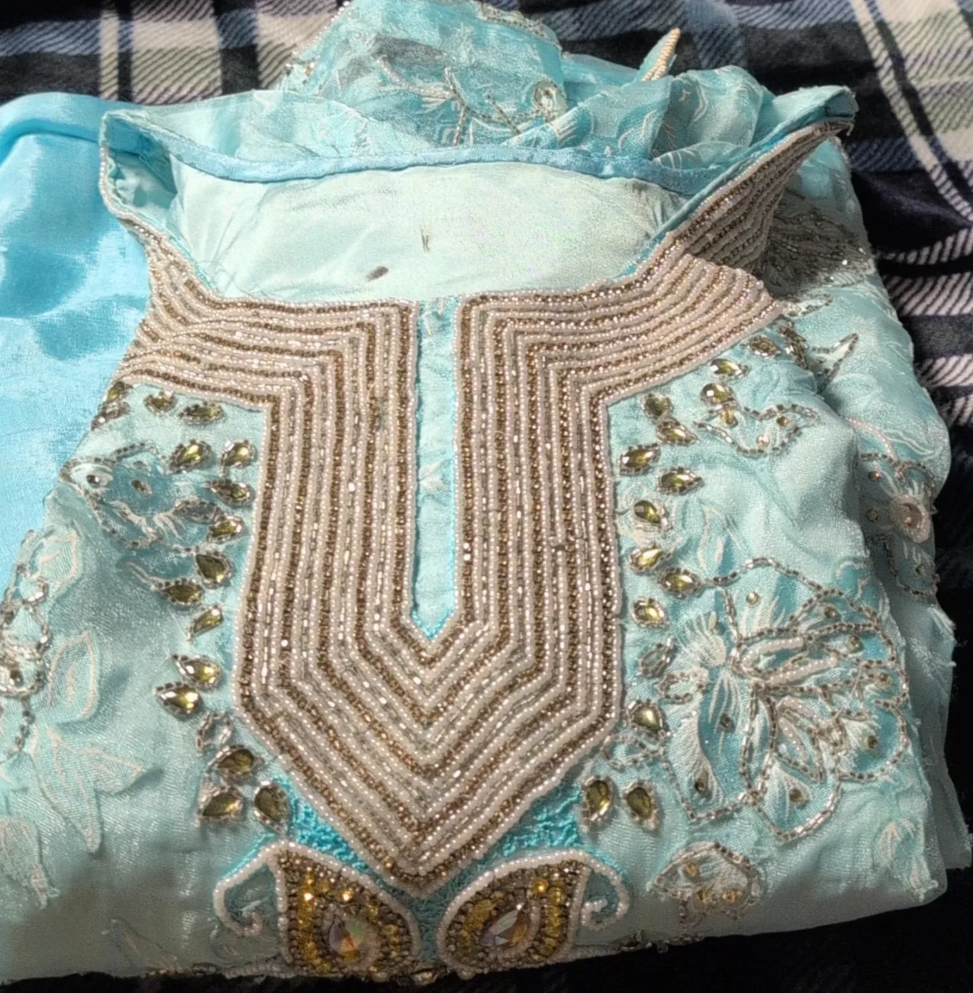 Light blue kurti with intricate beadwork and embroidery around the neckline and sleeves. It has a V-neck design with detailed silver and gold beading. The fabric appears to be a satin or silk blend.