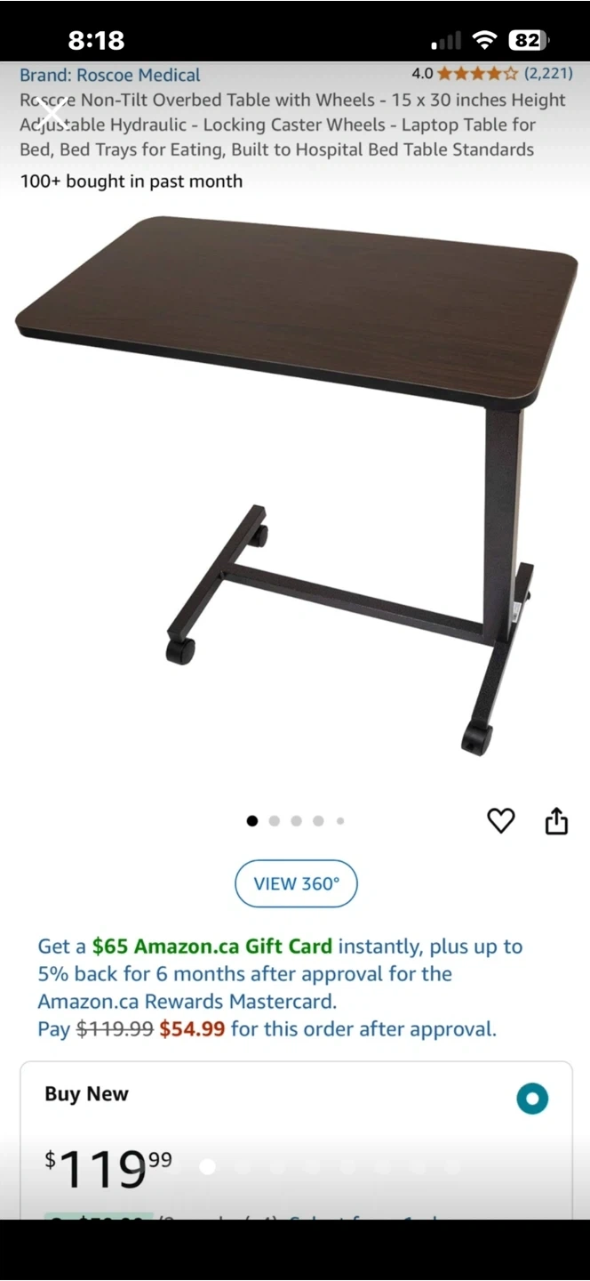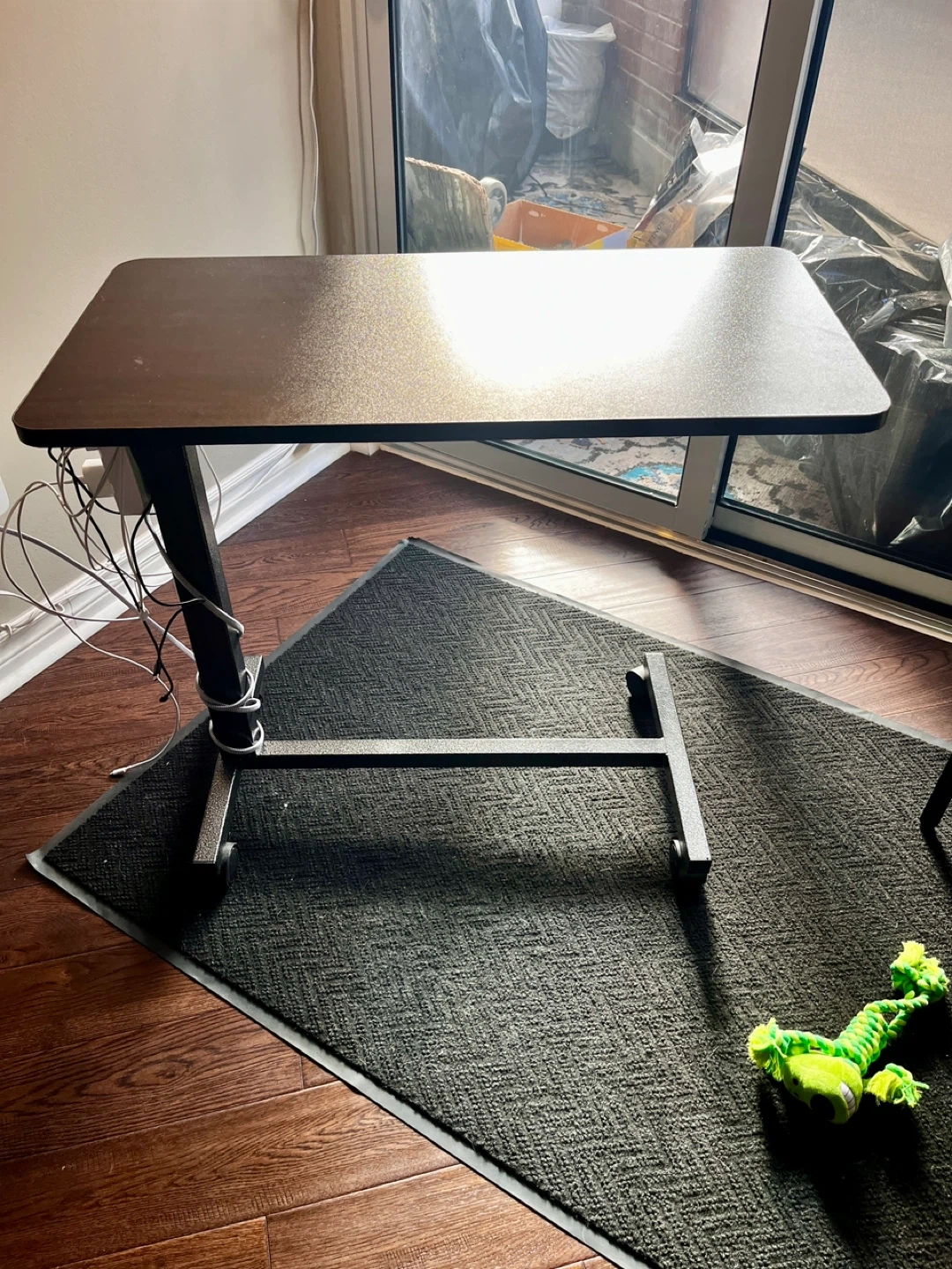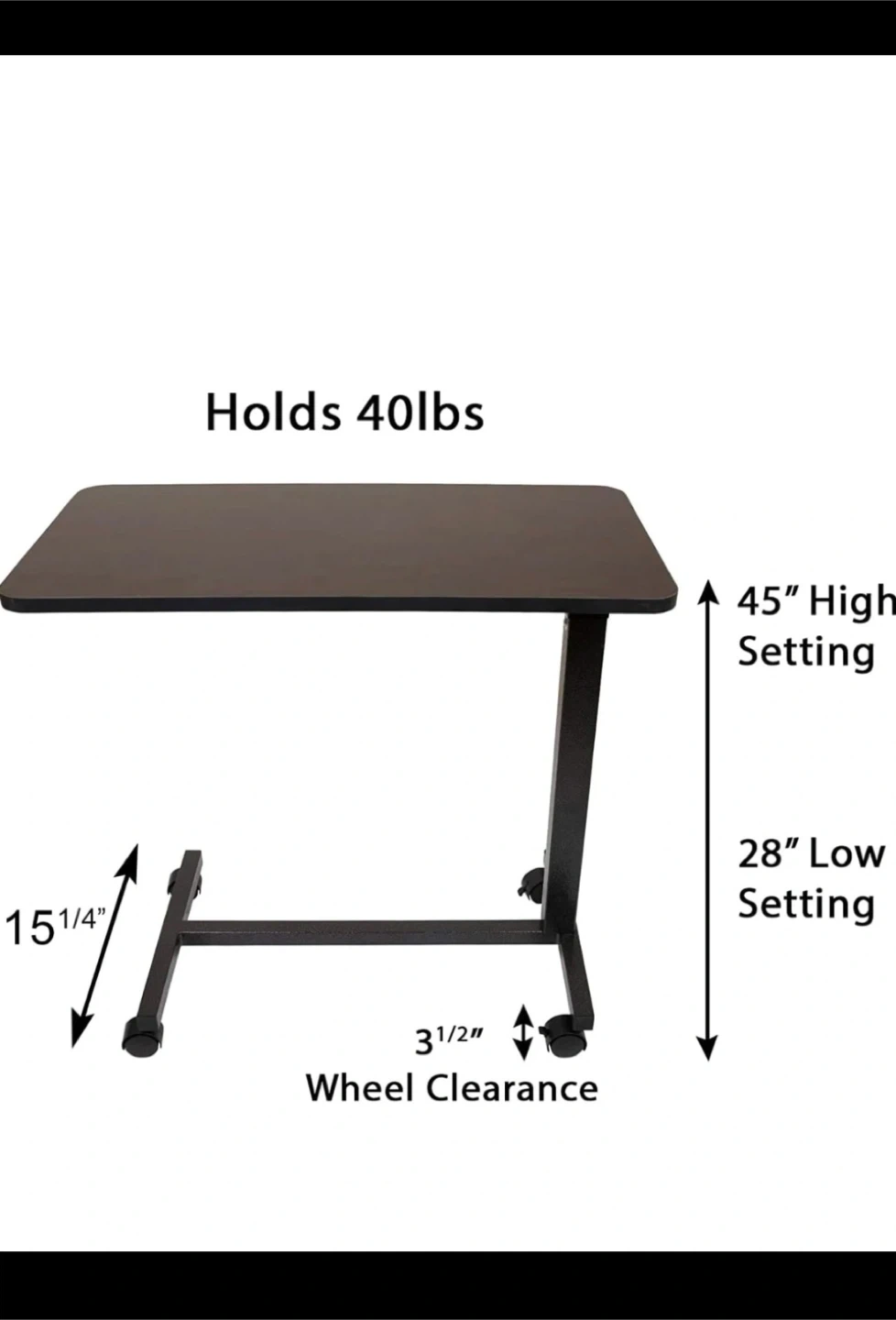 This Roscoe Medical non-tilt overbed table with wheels is perfect for using a laptop in bed or eating. It's adjustable from 28" to 45" in height, and the table top is 15 x 30 inches. It can hold up to 40lbs. Perfect condition. Does not come with power bar on the side. Cash only