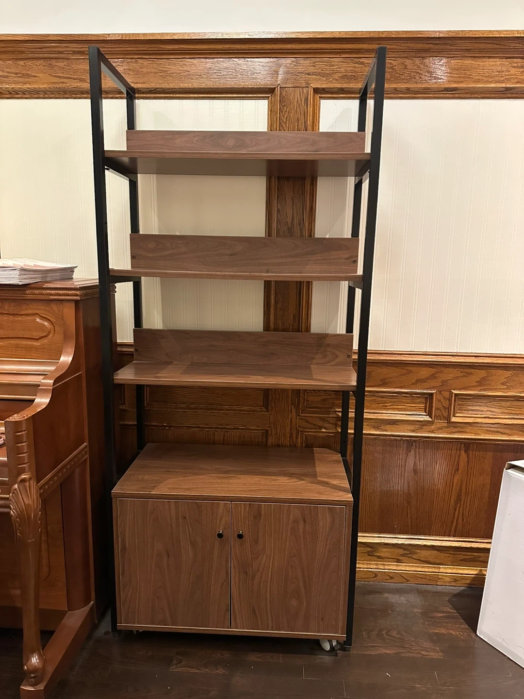 This desk has a wooden top and a black metal frame. It comes with a three-drawer unit attached to one side. The surface is a warm wood tone. A good desk and bookshelf for a home office setup.