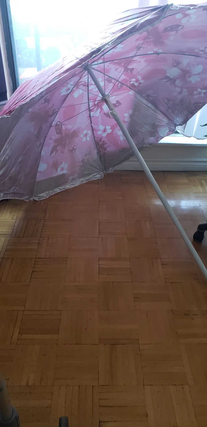 Selling a cute pink beach umbrella with a floral pattern! It's in great shape and perfect for keeping cool on sunny days at the beach or in the backyard