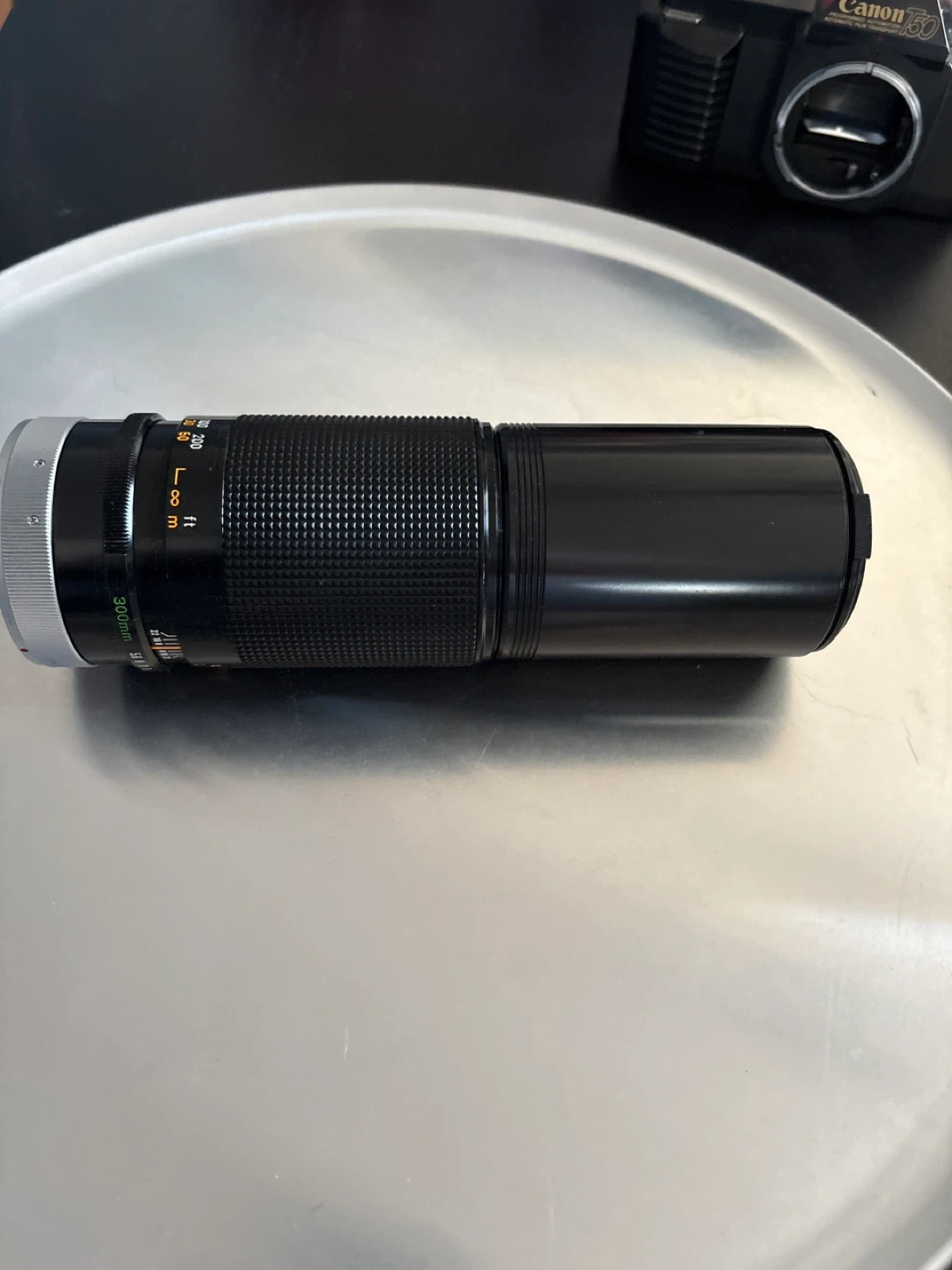 Canon 300mm telephoto lens with a maximum aperture of f/5.6. It features manual focus and a ribbed grip for adjustments. Great for capturing distant subjects!