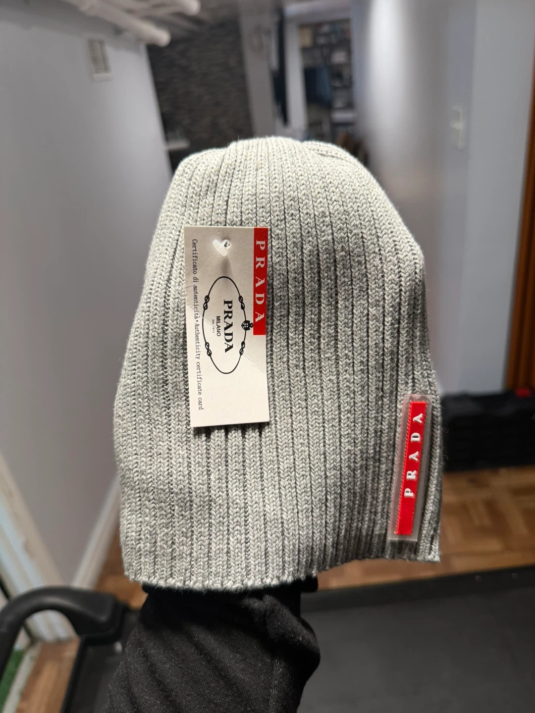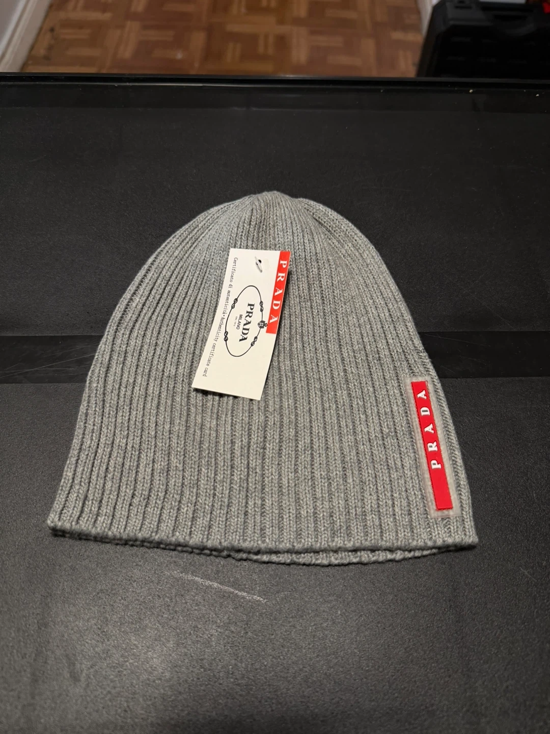 This is a Prada beanie hat in a ribbed knit. It's grey and features the Prada logo patch. It comes with authenticity tags attached.