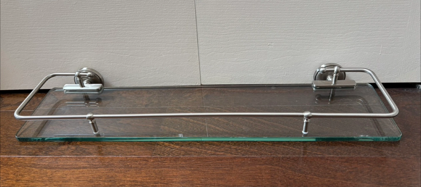 This is a glass shelf with a brushed metal railing.