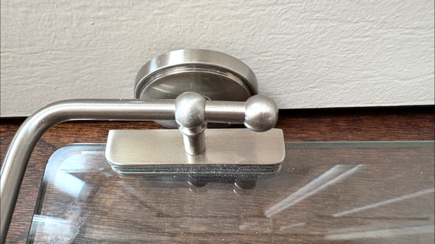It's made from tempered glass and has a stylish brushed nickel finish on the metal components.