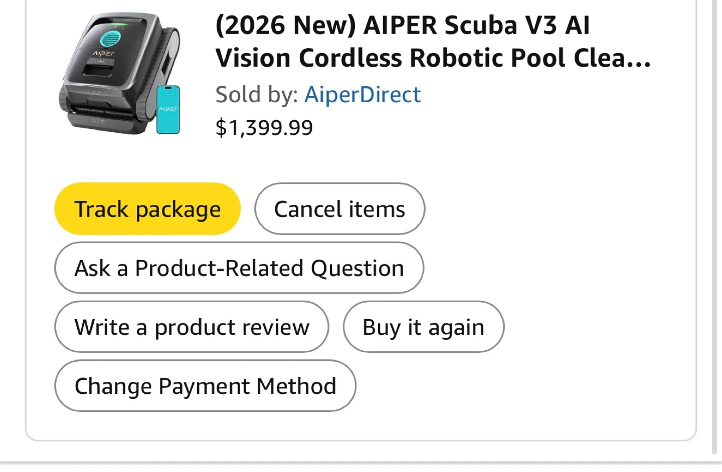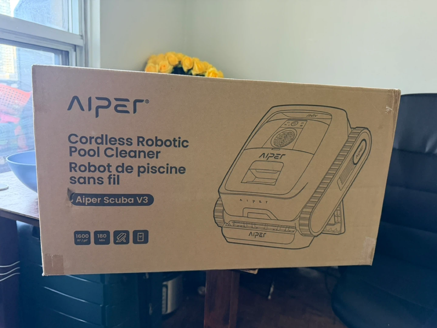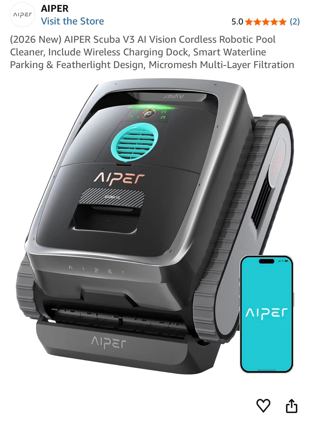 This is the Aiper Scuba V3 AI Vision cordless robotic pool cleaner. It features a wireless charging dock, smart waterline parking, and micromesh multi-layer filtration. This unit is great for keeping your pool clean with minimal effort!