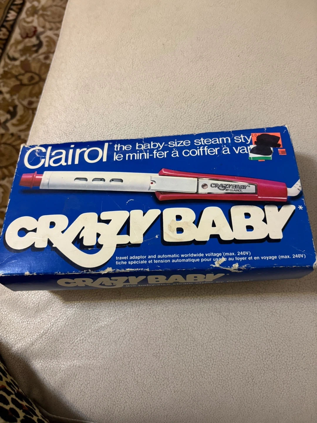 Clairol Crazy Baby mini steam styler. It's a travel adaptor and automatic worldwide voltage (max. 240V). This compact hair straightener is perfect for on-the-go styling. It comes with its original box.