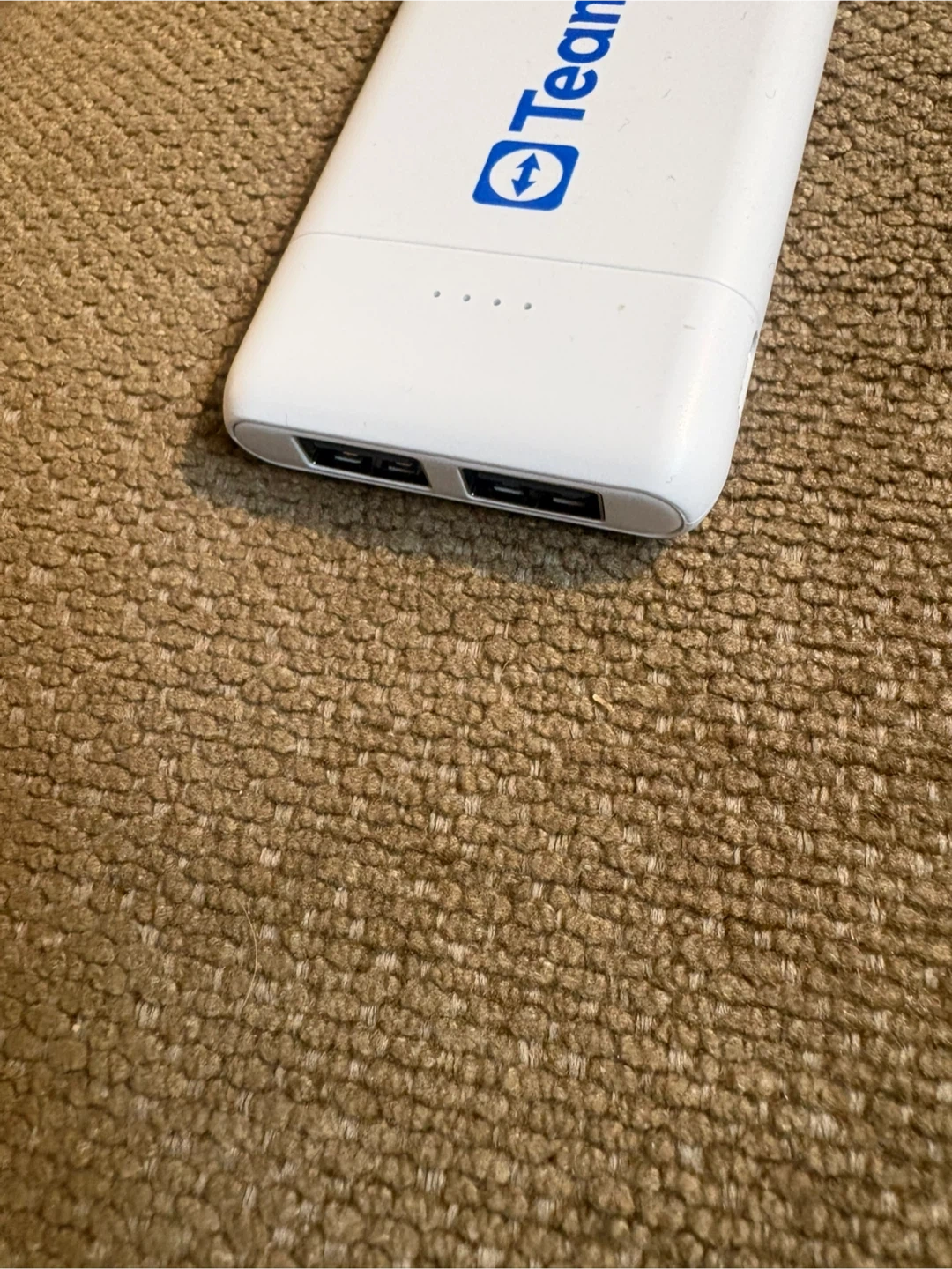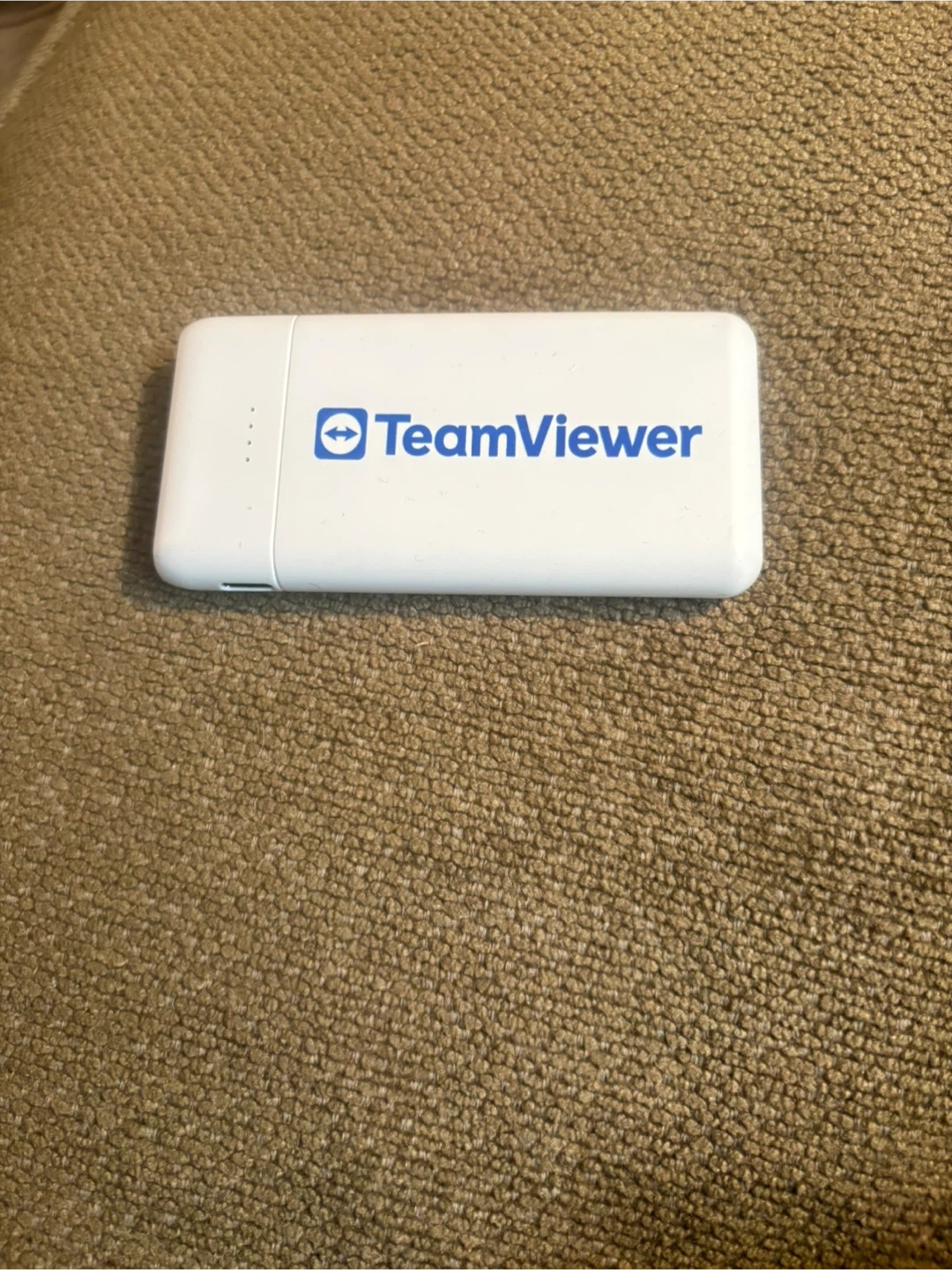 This is a TeamViewer branded white portable power bank. It features multiple USB ports for charging devices on the go. It's a handy gadget for keeping your electronics powered up when you're away from an outlet.