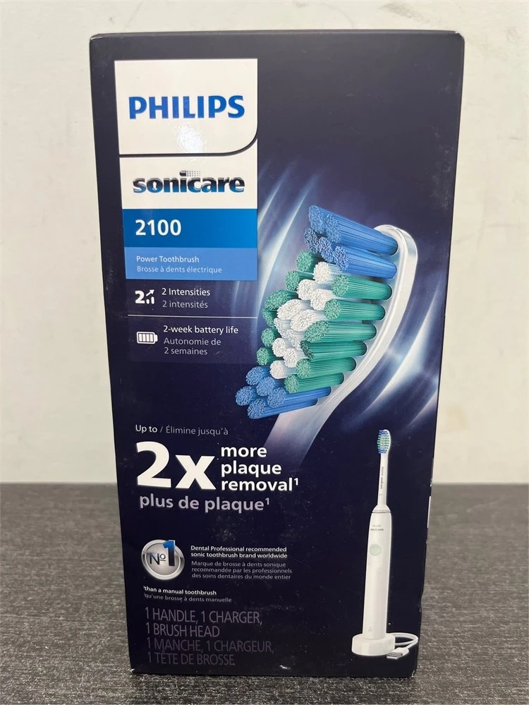 This Philips Sonicare 2100 power toothbrush offers 2 intensities and a 2-week battery life. It includes 1 handle, 1 charger, and 1 brush head. It's also noted as the #1 Dental Professional recommended sonic toothbrush brand worldwide.