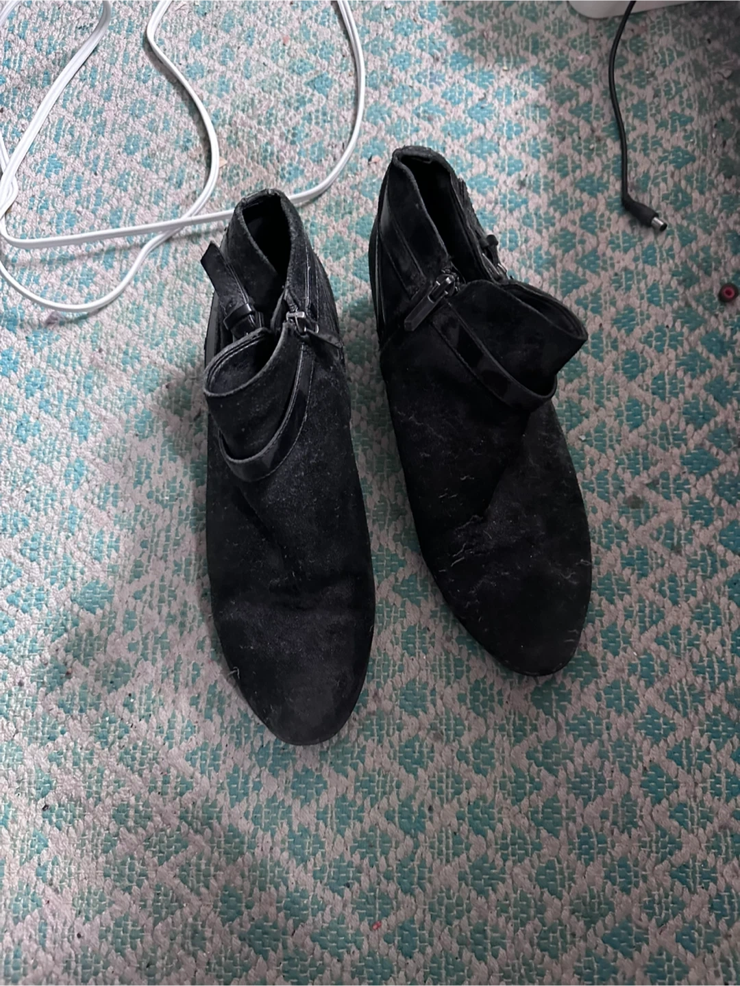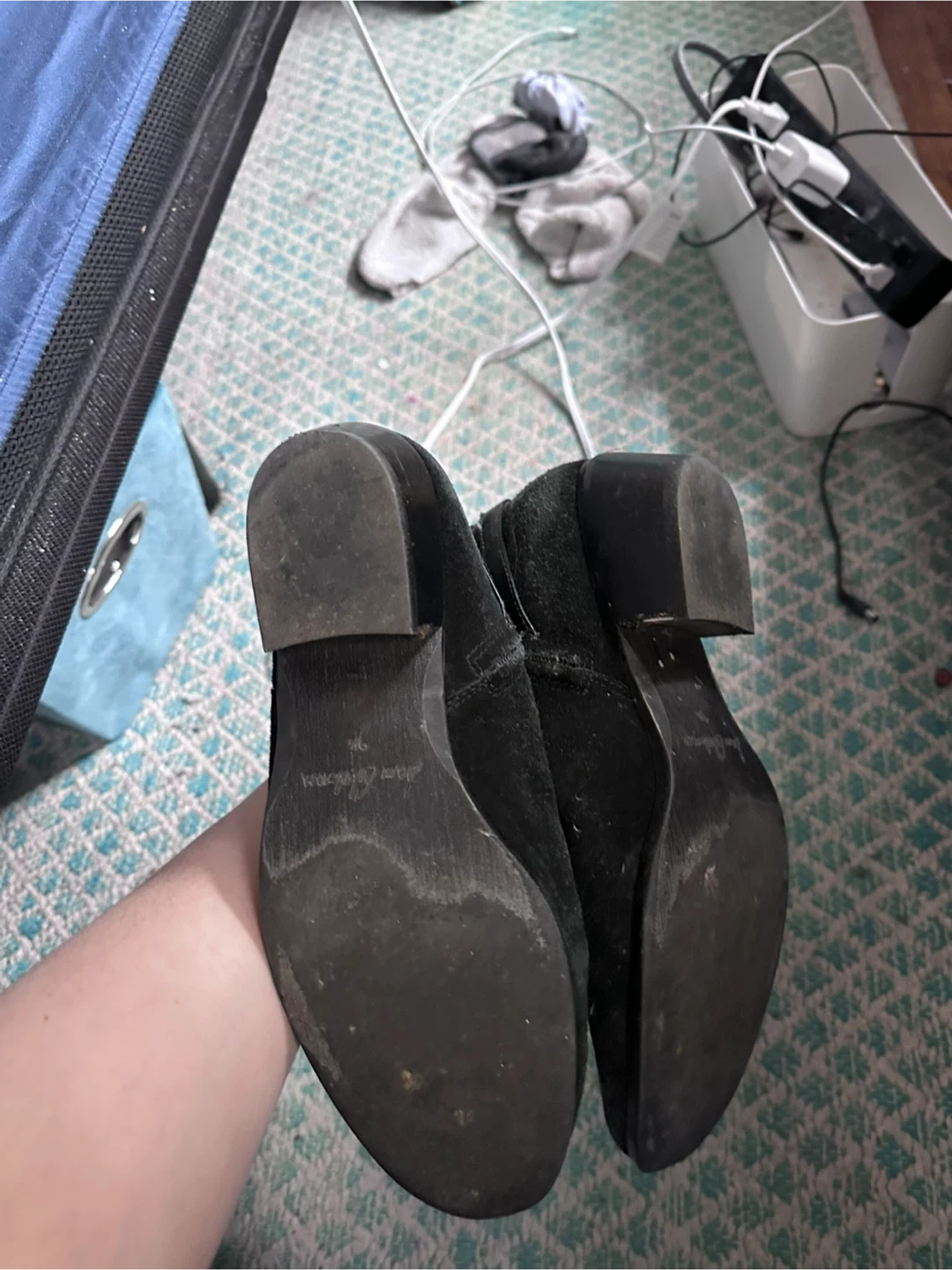 These boots have been gently worn and remain in great overall condition. The suede shows minor surface dust from storage that can easily be refreshed with professional or at-home suede cleaning. The boots have naturally softened and molded comfortably from wear, making them easy to slip on and comfortable for extended